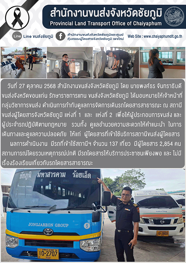 ดำเนินการกำกับ ดูแล การจัดการเดินรถโดยสารสาธารณะ ณ สถานีขนส่งผู้โดยสารจังหวัดชัยภูมิ