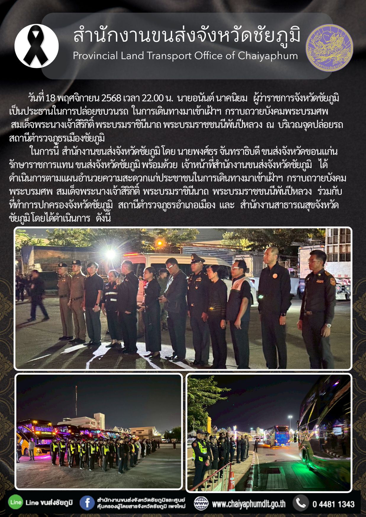 วันที่ 18 พฤศจิกายน 2568 เวลา 22.00 น. นายอนันต์ นาคนิยม ผู้ว่าราชการจังหวัดชัยภูมิ เป็นประธานในการปล่อยขบวนรถ ในการเดินทางมาเข้าเฝ้าฯ กราบถวายบังคมพระบรมศพ สมเด็จพระนางเจ้าสิริกิติ์ พระบรมราชินีนาถ พระบรมราชชนนีพันปีหลวง ณ บริเวณจุดปล่อยรถสถานีตำรวจภูธรเมืองชัยภูมิ ในการนี้ สำนักงานขนส่งจังหวัดชัยภูมิ โดย นายพงศ์ธร จันทราธิบดี ขนส่งจังหวัดขอนแก่น รักษาราชการแทน ขนส่งจังหวัดชัยภูมิ พร้อมด้วยเจ้าหน้าที่สำนักงานขนส่งจังหวัดชัยภูมิ ดำเนินการตามแผนอำนวยความสะดวกแก่ประชาชนในการเดินทางมาเข้าเฝ้าฯ กราบถวายบังคมพระบรมศพ สมเด็จพระนางเจ้าสิริกิติ์ พระบรมราชินีนาถ พระบรมราชชนนีพันปีหลวง ร่วมกับ ที่ทำการปกครองจังหวัดชัยภูมิ สถานีตำรวจภูธรอำเภอเมือง และสำนักงานสาธารณสุขจังหวัดชัยภูมิ โดยได้ดำเนินการ ดังนี้