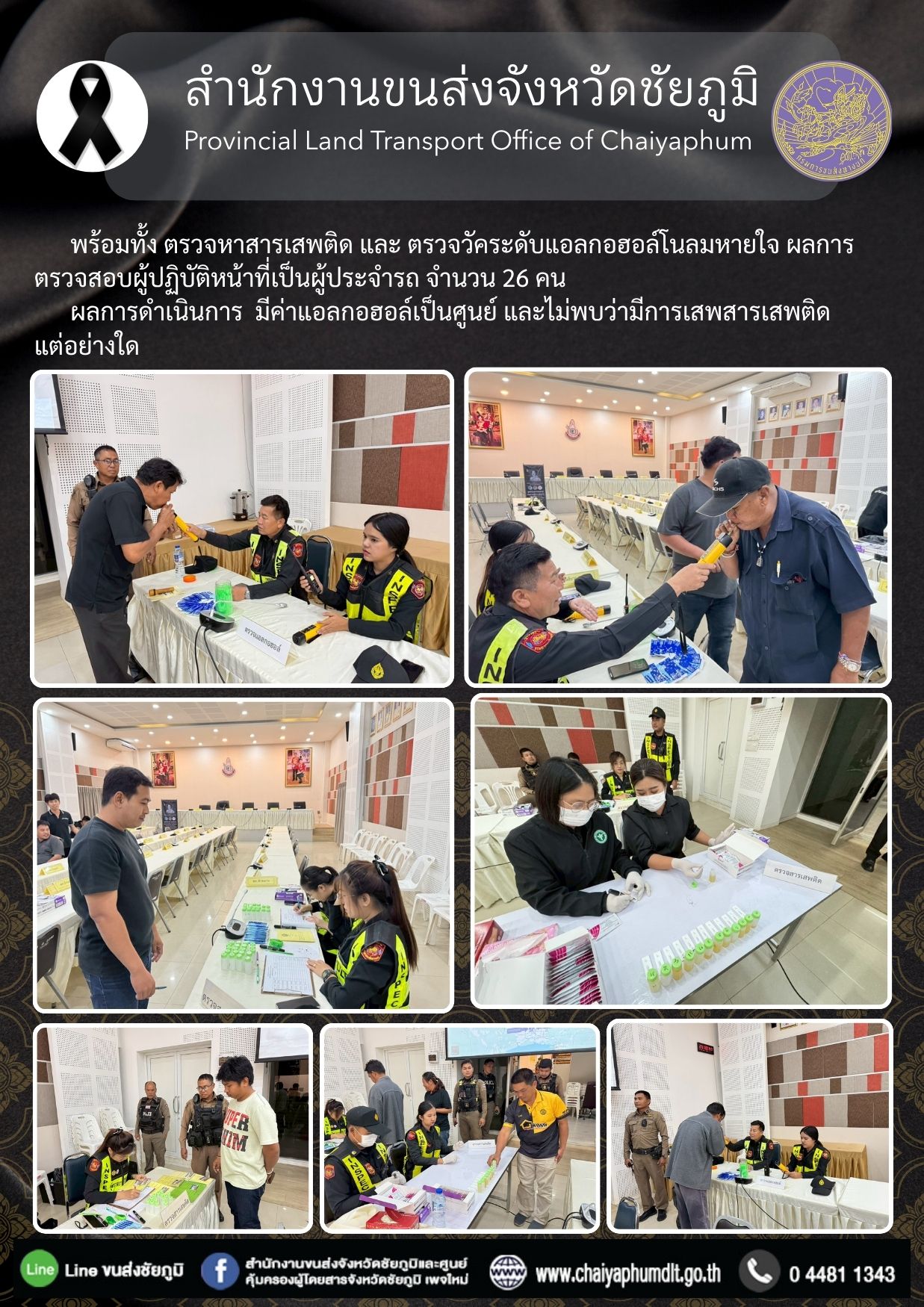 1. จัดประชุมผู้ปฏิบัติหน้าที่เป็นผู้ประจำรถ ได้แก่ พนักงานขับรถและผู้บริการสำหรับรถโดยสารไม่ประจำทาง ณ ห้องประชุมเตชะธัมโม สถานีตำรวจภูธรอำเภอเมือง โดยกำชับให้ปฏิบัติตามข้อกำหนดว่าด้วยความปลอดภัยในการขนส่ง เส้นทางการเดินรถ จุดจอดพักรถและกำหนดการ การใช้ความเร็ว ชั่วโมงการทำงาน ตลอดถึงการให้คำแนะนำกับผู้โดยสารให้รับทราบวิธีการใช้งานอุปกรณ์ด้านความปลอดภัย พร้อมทั้ง ตรวจหาสารเสพติด และ ตรวจวัดระดับแอลกอฮอล์โนลมหายใจ ผลการตรวจสอบผู้ปฏิบัติหน้าที่เป็นผู้ประจำรถ จำนวน 26 คน มีความพร้อมด้านสุขภาพ มีค่าแอลกอฮอล์เป็นศูนย์ และไม่พบว่ามีการเสพสารเสพติดแต่อย่างใด
