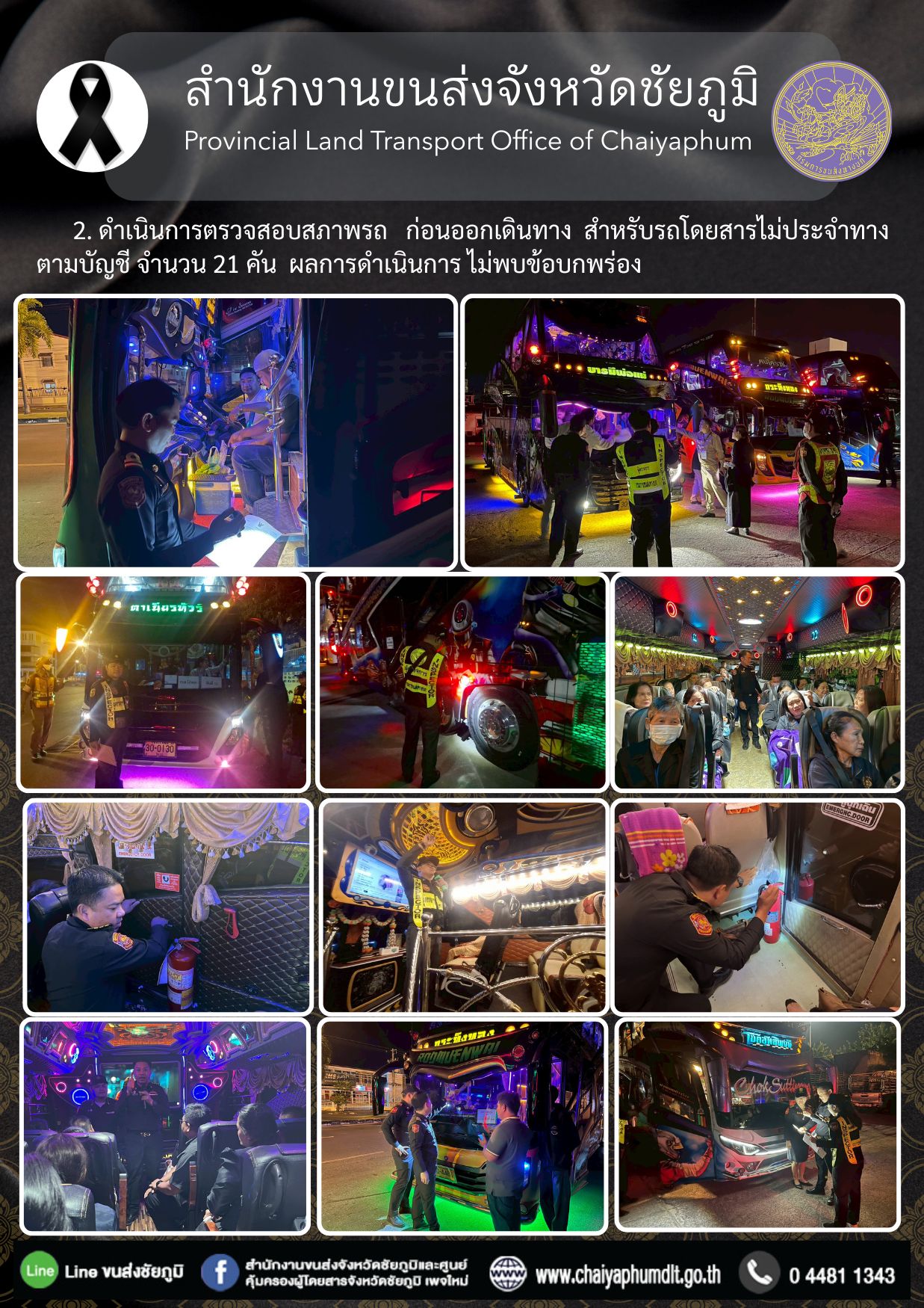 2. ดำเนินการตรวจสอบสภาพรถก่อนออกเดินทาง สำหรับรถโดยสารไม่ประจำทางตามบัญชี จำนวน 21 คัน ผลการดำเนินการ ไม่พบข้อบกพร่อง