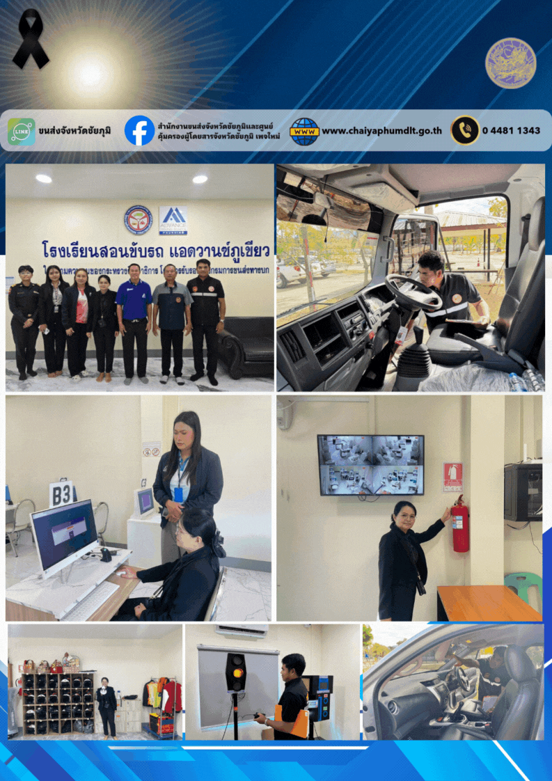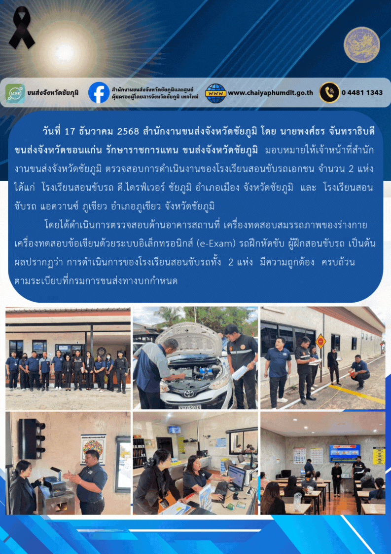 สำนักงานขนส่งจังหวัดชัยภูมิ โดย นายพงศ์ธร จันทราธิบดี ขนส่งจังหวัดขอนแก่น รักษาราชการแทน ขนส่งจังหวัด มอบหมายให้ เจ้าหน้าที่สำนักงานขนส่งจังหวัดชัยภูมิ ตรวจสอบการดำเนินงานของโรงเรียนสอนขับรถเอกชน จำนวน 2 แห่ง ได้แก่ โรงเรียนสอนขับรถ ดี.ไดรฟ์เวอร์ ชัยภูมิ อำเภอเมือง จังหวัดชัยภูมิ และโรงเรียนสอนขับรถ แอดวานซ์ ภูเขียว อำเภอภูเขียว จังหวัดชัยภูมิ โดยได้ดำเนินการตรวจสอบด้านอาคารสถานที่ เครื่องทดสอบสมรรถภาพของร่างกาย เครื่องทดสอบข้อเขียนด้วยระบบอิเล็กทรอนิกส์ (e-Exam) รถฝึกหัดขับ ผู้ฝึกสอนขับรถ เป็นต้น ผลปรากฏว่า การดำเนินการของโรงเรียนสอนขับรถทั้ง 2 แห่ง มีความถูกต้อง ครบถ้วน ตามระเบียบที่กรมการขนส่งทางบกกำหนด