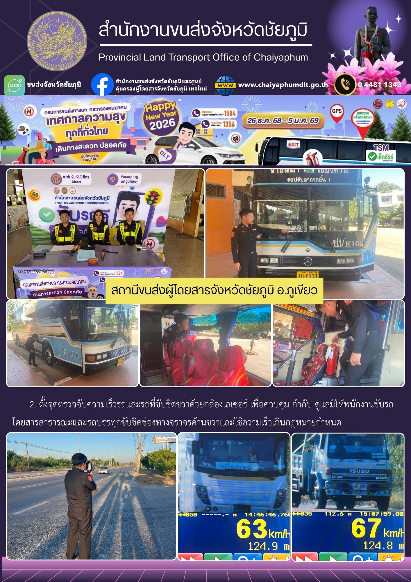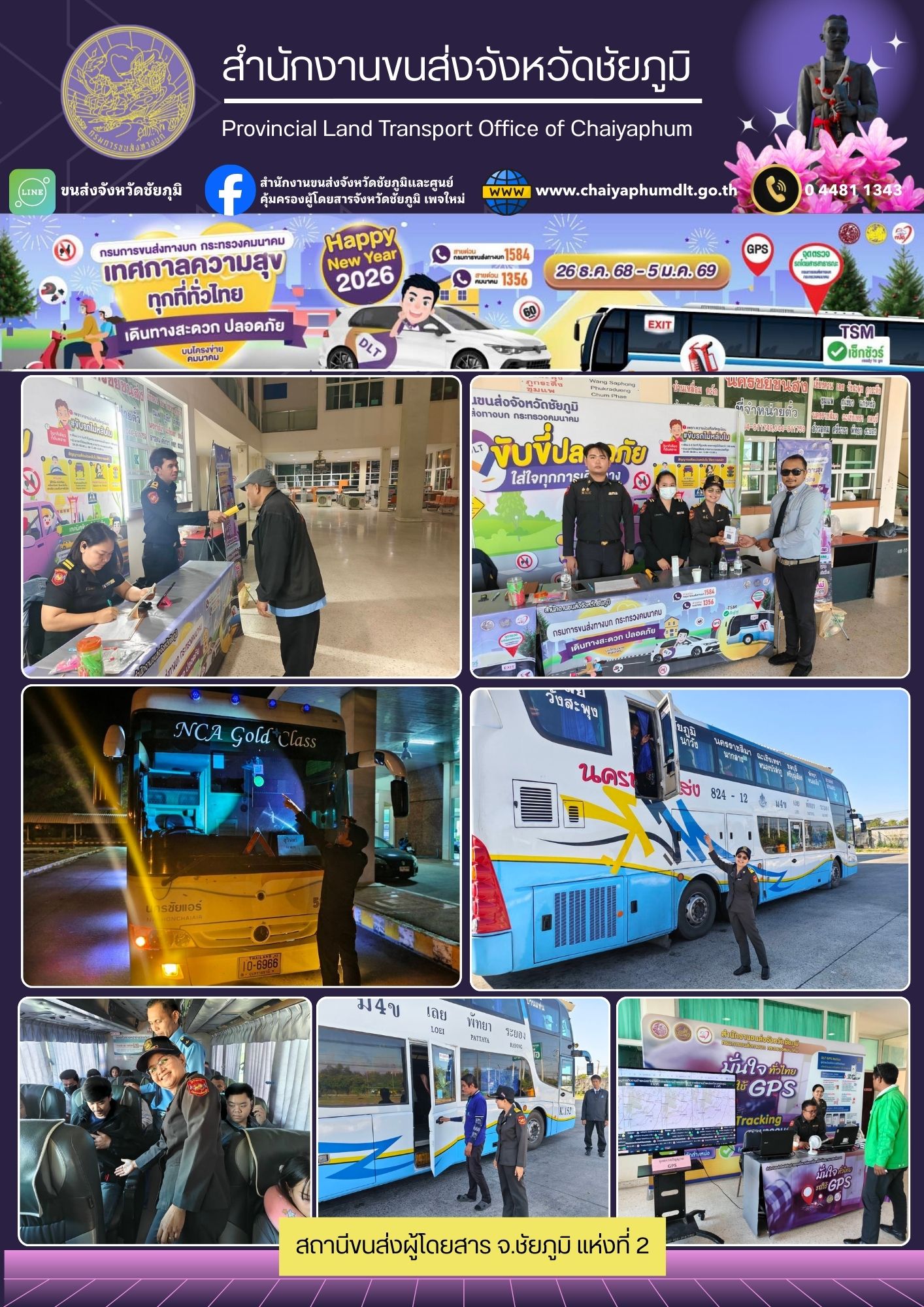 สำนักงานขนส่งจังหวัดชัยภูมิ โดย นายพงศ์ธร จันทราธิบดี ขนส่งจังหวัดขอนแก่น รักษาราชการแทน ขนส่งจังหวัดชัยภูมิ มอบหมายให้ผู้ตรวจการ และ เจ้าหน้าที่ สำนักงานขนส่งจังหวัดชัยภูมิ ดำเนินการตามแผนอำนวยความสะดวกและความปลอดภัย รองรับการเดินทางของประชาชน ในช่วงเทศกาลปีใหม่ 2569 ระหว่างวันที่ 26 ธันวาคม 2568 – 5 มกราคม 2569