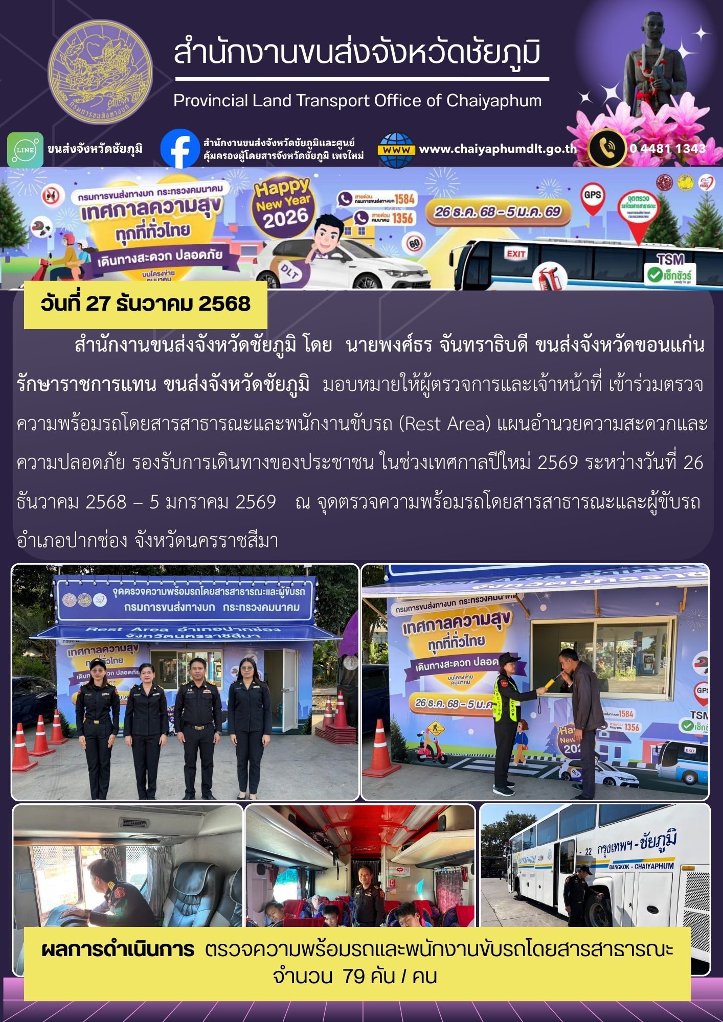 สำนักงานขนส่งจังหวัดชัยภูมิ โดย นายพงศ์ธร จันทราธิบดี ขนส่งจังหวัดขอนแก่น รักษาราชการแทน ขนส่งจังหวัดชัยภูมิ มอบหมายให้ผู้ตรวจการและเจ้าหน้าที่ เข้าร่วมตรวจความพร้อมรถโดยสารสาธารณะและพนักงานขับรถ (Rest Area) แผนอำนวยความสะดวกและความปลอดภัย รองรับการเดินทางของประชาชน ในช่วงเทศกาลปีใหม่ 2569 ระหว่างวันที่ 26 ธันวาคม 2568 – 5 มกราคม 2569 ณ จุดตรวจความพร้อมรถโดยสารสาธารณะและผู้ขับรถ อำเภอปากช่อง จังหวัดนครราชสีมา