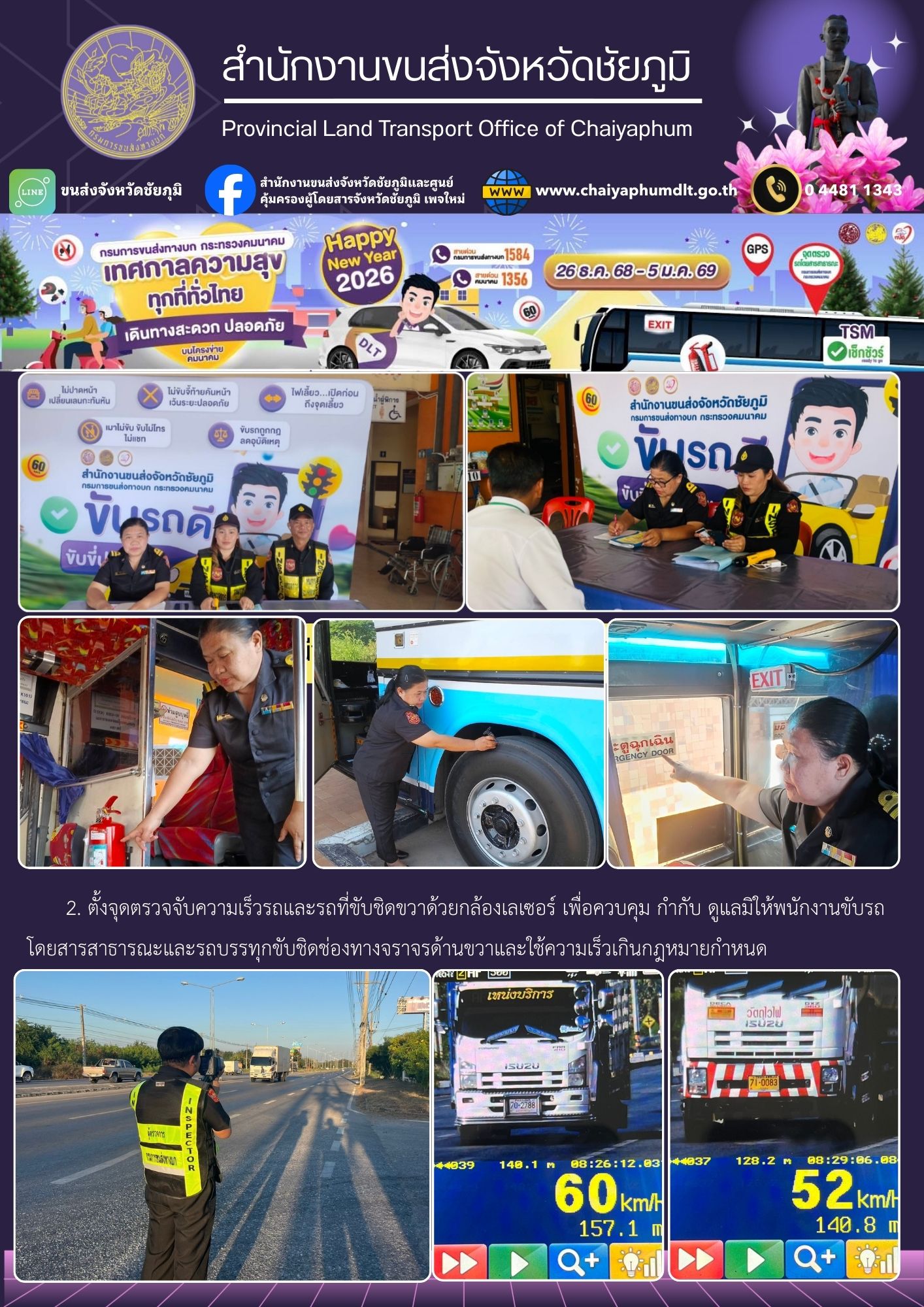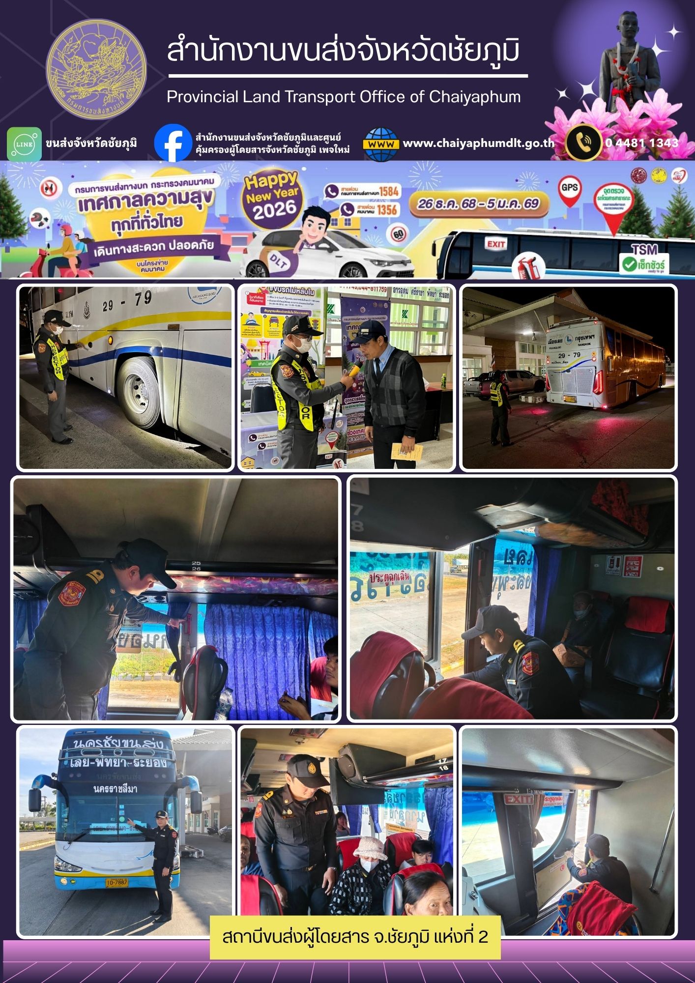 สำนักงานขนส่งจังหวัดชัยภูมิ โดย นายพงศ์ธร จันทราธิบดี ขนส่งจังหวัดขอนแก่น รักษาราชการแทน ขนส่งจังหวัดชัยภูมิ มอบหมายให้ผู้ตรวจการ และ เจ้าหน้าที่ สำนักงานขนส่งจังหวัดชัยภูมิ ดำเนินการตามแผนอำนวยความสะดวกและความปลอดภัย รองรับการเดินทางของประชาชน ในช่วงเทศกาลปีใหม่ 2569 ระหว่างวันที่ 26 ธันวาคม 2568 – 5 มกราคม 2569