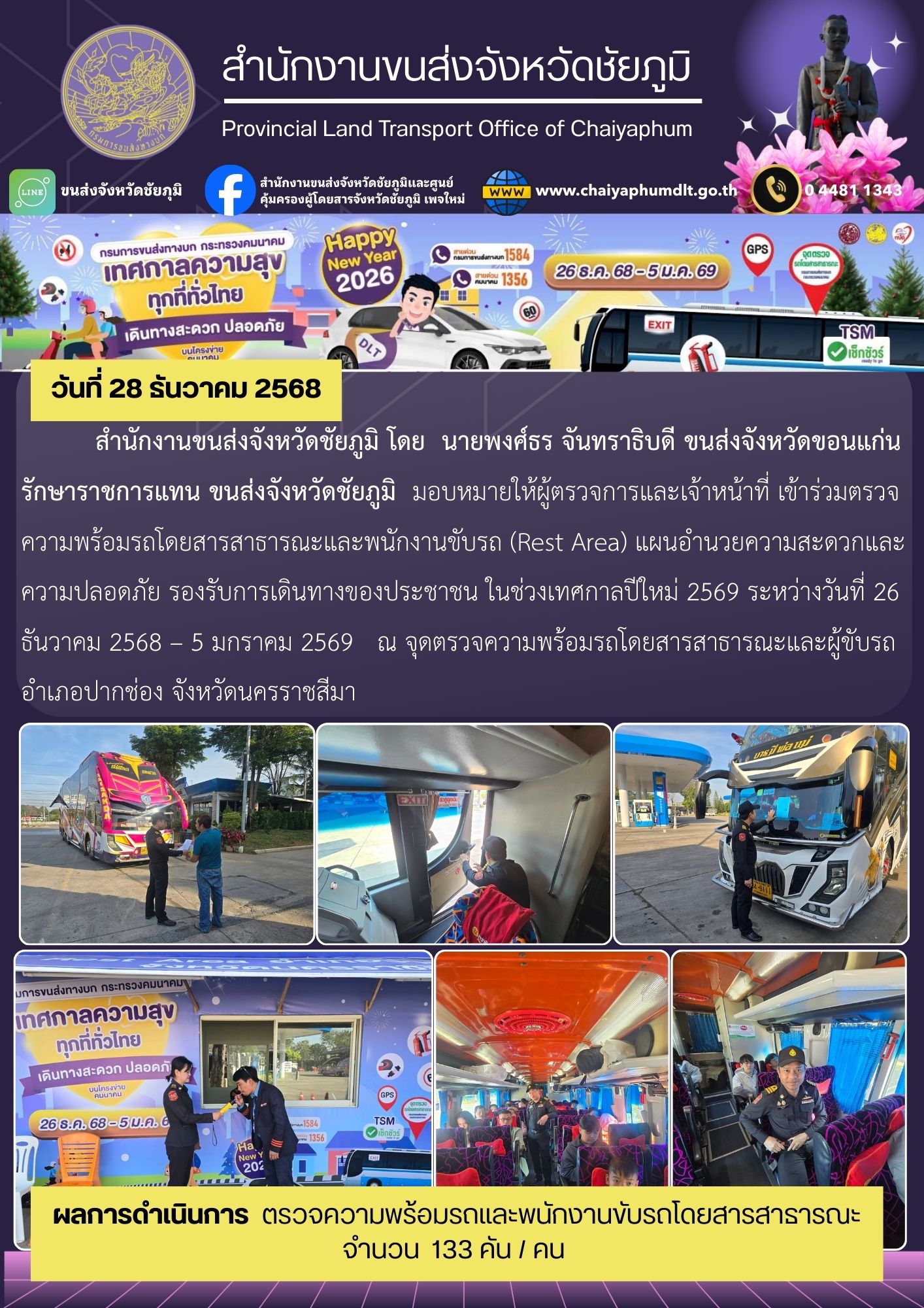 สำนักงานขนส่งจังหวัดชัยภูมิ โดย นายพงศ์ธร จันทราธิบดี ขนส่งจังหวัดขอนแก่น รักษาราชการแทน ขนส่งจังหวัดชัยภูมิ มอบหมายให้ผู้ตรวจการและเจ้าหน้าที่ เข้าร่วมตรวจความพร้อมรถโดยสารสาธารณะและพนักงานขับรถ (Rest Area) แผนอำนวยความสะดวกและความปลอดภัย รองรับการเดินทางของประชาชน ในช่วงเทศกาลปีใหม่ 2569 ระหว่างวันที่ 26 ธันวาคม 2568 – 5 มกราคม 2569 ณ จุดตรวจความพร้อมรถโดยสารสาธารณะและผู้ขับรถ อำเภอปากช่อง จังหวัดนครราชสีมา