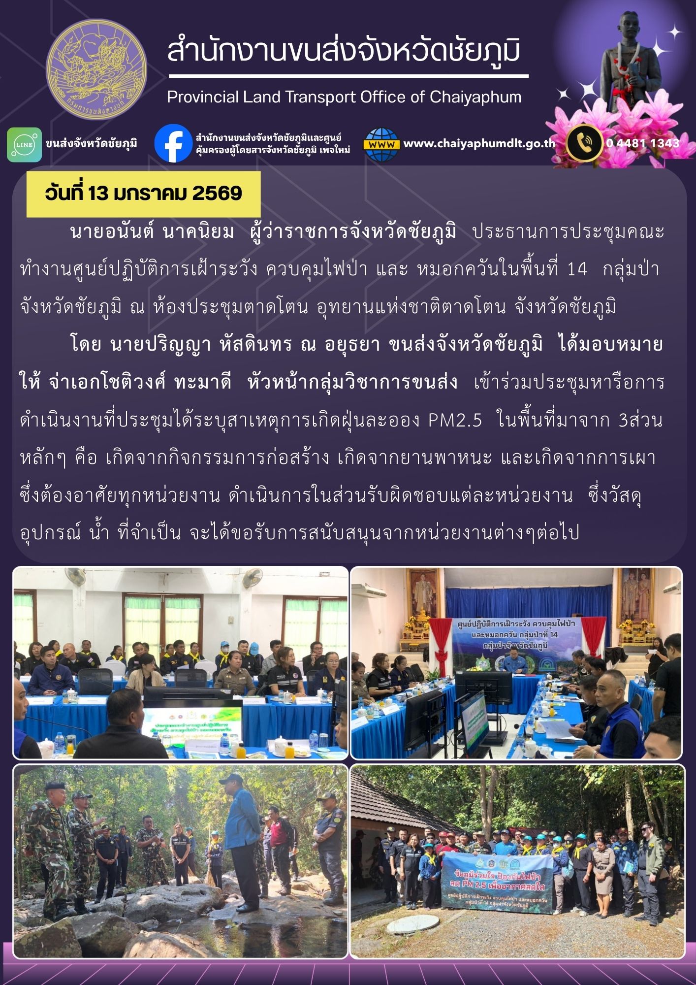 นายอนันต์ นาคนิยม ผู้ว่าราชการจังหวัดชัยภูมิ ประธานการประชุมคณะทำงานศูนย์ปฏิบัติการ เฝ้าระวัง ควบคุมไฟป่า และหมอกควันในพื้นที่ 14 กลุ่มป่า จังหวัดชัยภูมิ ณ ห้องประชุมตาดโตน อุทยานแห่งชาติตาดโตน จังหวัดชัยภูมิ โดยนายปริญญา หัสดินทร ณ อยุธยา ขนส่งจังหวัดชัยภูมิ ได้มอบหมายให้ จ่าเอกโชติวงศ์ ทะมาดี หัวหน้ากลุ่มวิชาการขนส่ง เข้าร่วมประชุมหารือการดำเนินงาน ที่ประชุมได้ระบุสาเหตุการเกิดฝุ่นละออง PM2.5 ในพื้นที่มาจาก 3 ส่วนหลักๆ คือ เกิดจากกิจกรรมการก่อสร้าง เกิดจากยานพาหนะ และเกิดจากการเผา ซึ่งต้องอาศัยทุกหน่วยงานดำเนินการในส่วนรับผิดชอบแต่ละหน่วยงาน ซึ่งวัสดุ อุปกรณ์ น้ำ ที่จำเป็น จะได้ขอรับการสนับสนุนจากหน่วยงานต่างๆ ต่อไป