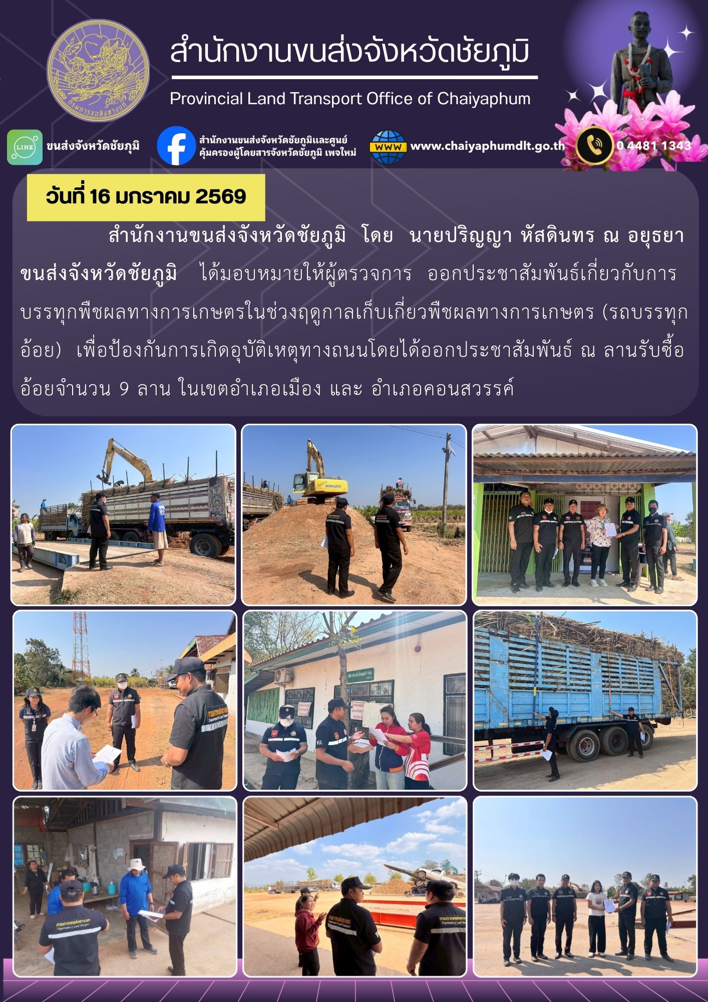 สำนักงานขนส่งจังหวัดชัยภูมิ โดย นายปริญญา หัสดินทร ณ อยุธยา ขนส่งจังหวัดชัยภูมิ ได้มอบหมายให้ผู้ตรวจการ ออกประชาสัมพันธ์เกี่ยวกับการบรรทุกพืชผลทางการเกษตร ในช่วงฤดูกาลเก็บเกี่ยวพืชผลทางการเกษตร (รถบรรทุกอ้อย) เพื่อป้องกันการเกิดอุบัติเหตุทางถนน โดยได้ออกประชาสัมพันธ์ ณ ลานรับซื้ออ้อยจำนวน 9 ลาน ในเขตอำเภอเมืองและอำเภอคอนสวรรค์