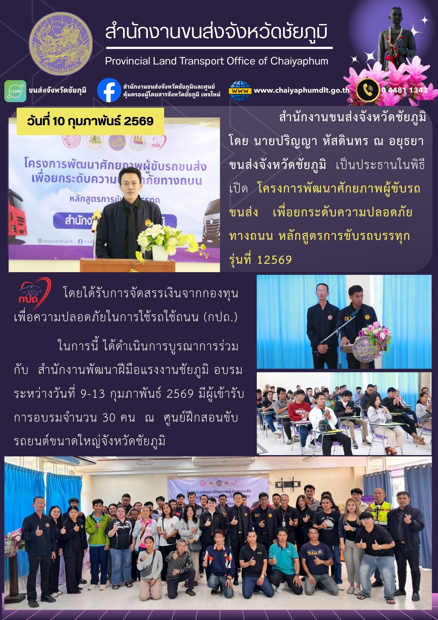 สำนักงานขนส่งจังหวัดชัยภูมิ โดย นายปริญญา หัสดินทร ณ อยุธยา ขนส่งจังหวัดชัยภูมิ ได้เป็นประธานในพิธีเปิดโครงการพัฒนาศักยภาพผู้ขับรถขนส่ง เพื่อยกระดับความปลอดภัยทางถนน หลักสูตรการขับรถบรรทุก รุ่นที่ 12569 โดยได้รับการจัดสรรเงินจากกองทุนเพื่อความปลอดภัยในการใช้รถใช้ถนน (กปถ.) ในการนี้ ได้ดำเนินการบูรณาการร่วมกับสำนักงานพัฒนาฝีมือแรงงานชัยภูมิ อบรมระหว่างวันที่ 9-13 กุมภาพันธ์ 2569 มีผู้เข้ารับการอบรมจำนวน 30 คน ณ ศูนย์ฝึกสอนขับรถยนต์ขนาดใหญ่จังหวัดชัยภูมิ