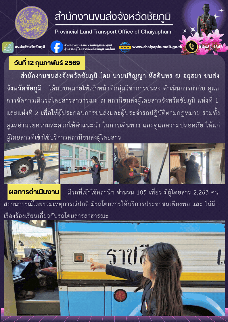 สำนักงานขนส่งจังหวัดชัยภูมิ ดำเนินการกำกับ ดูแล การจัดการเดินรถโดยสารสาธารณะ ณ สถานีขนส่งผู้โดยสารจังหวัดชัยภูมิ  เพื่อให้ผู้ประกอบการขนส่ง และผู้ประจำรถปฏิบัติตามกฎหมาย รวมทั้งดูแลอำนวยความสะดวก ให้คำแนะนำในการเดินทาง และดูแลความปลอดภัยให้แก่ผู้โดยสารที่เข้าใช้บริการสถานีขนส่งผู้โดยสาร สถานการณ์โดยรวมเหตุการณ์ปกติ มีรถโดยสารให้บริการประชาชนเพียงพอ และไม่มีเรื่องร้องเรียนเกี่ยวกับรถโดยสารสาธารณะ