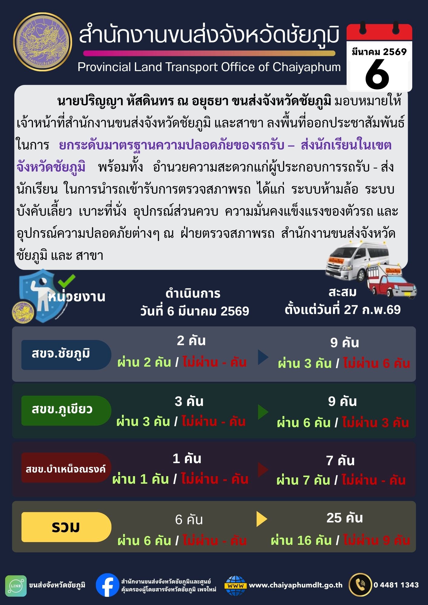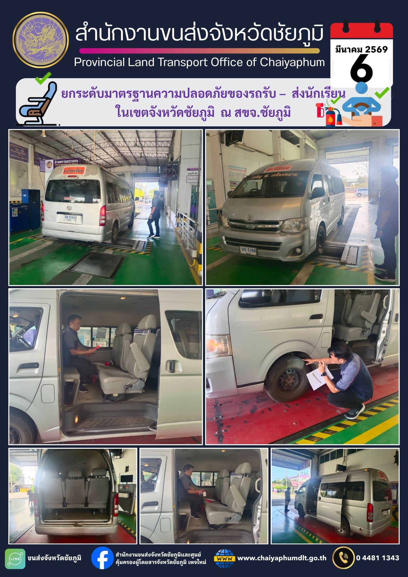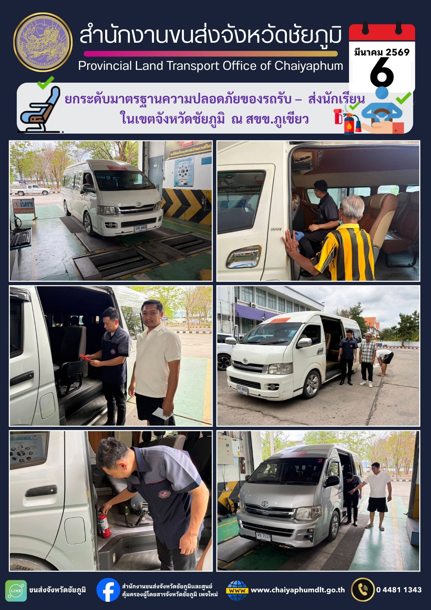 สำนักงานขนส่งจังหวัดชัยภูมิ โดย นายปริญญา หัสดินทร ณ อยุธยา ขนส่งจังหวัดชัยภูมิ มอบหมายให้เจ้าหน้าที่สำนักงานขนส่งจังหวัดชัยภูมิ และ สาขา ลงพื้นที่ออกประชาสัมพันธ์ในการยกระดับมาตรฐานความปลอดภัยของรถรับ – ส่งนักเรียนในเขตจังหวัดชัยภูมิ พร้อมทั้ง อำนวยความสะดวกแก่ผู้ประกอบการรถรับ-ส่งนักเรียน ในการนำรถเข้ารับการตรวจสภาพรถ ได้แก่ ระบบห้ามล้อ ระบบบังคับเลี้ยว เบาะที่นั่ง อุปกรณ์ส่วนควบ ความมั่นคงแข็งแรงของตัวรถ และอุปกรณ์ความปลอดภัยต่างๆ ณ ฝ่ายตรวจสภาพรถ สำนักงานขนส่งจังหวัดชัยภูมิ และสาขา