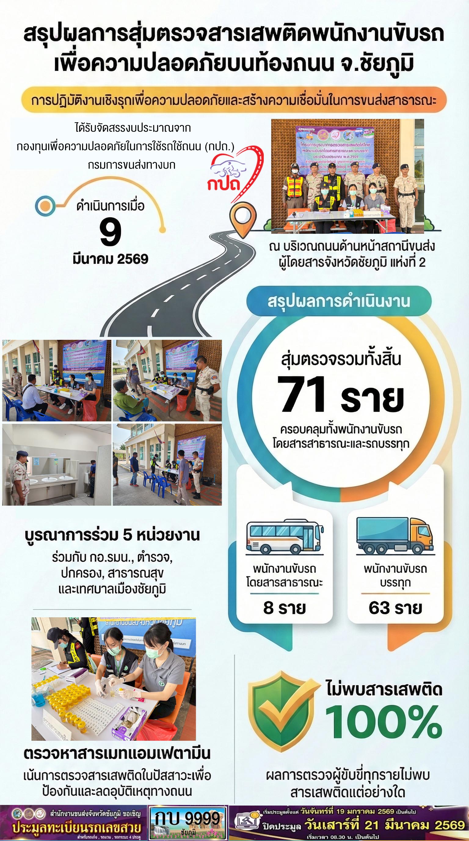 สำนักงานขนส่งจังหวัดชัยภูมิ โดย นายปริญญา หัสดินทร ณ อยุธยา ขนส่งจังหวัดชัยภูมิ ได้มอบหมายให้ผู้ตรวจการขนส่งตั้งจุดตรวจสอบสารเสพติดให้โทษ (เมทแอมเฟตามีน) ในปัสสาวะของพนักงานขับรถโดยสารสาธารณะและรถบรรทุก เพื่อป้องกันและลดอุบัติเหตุทางถนน