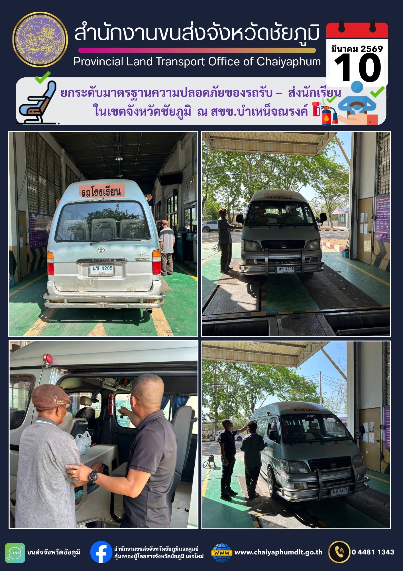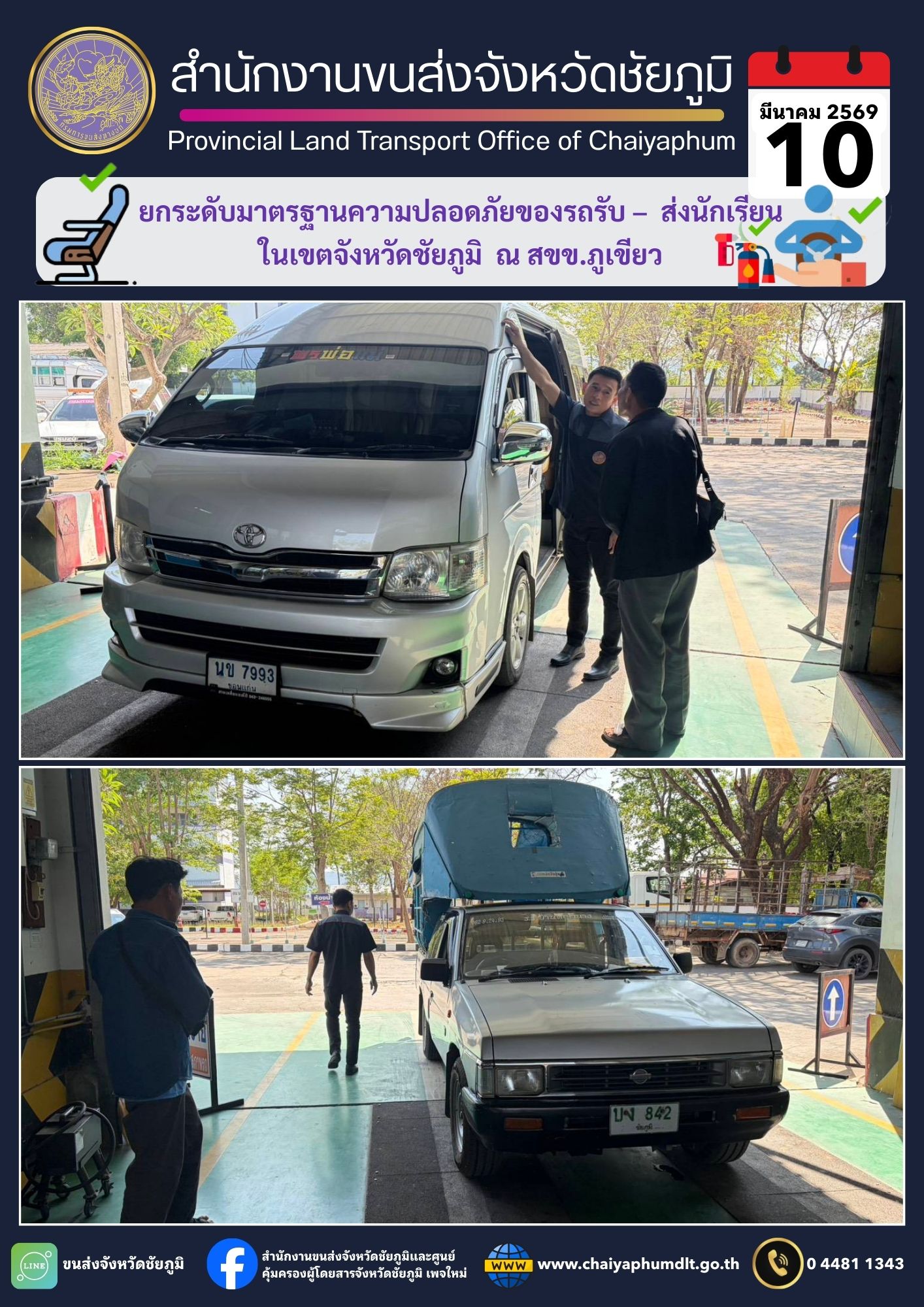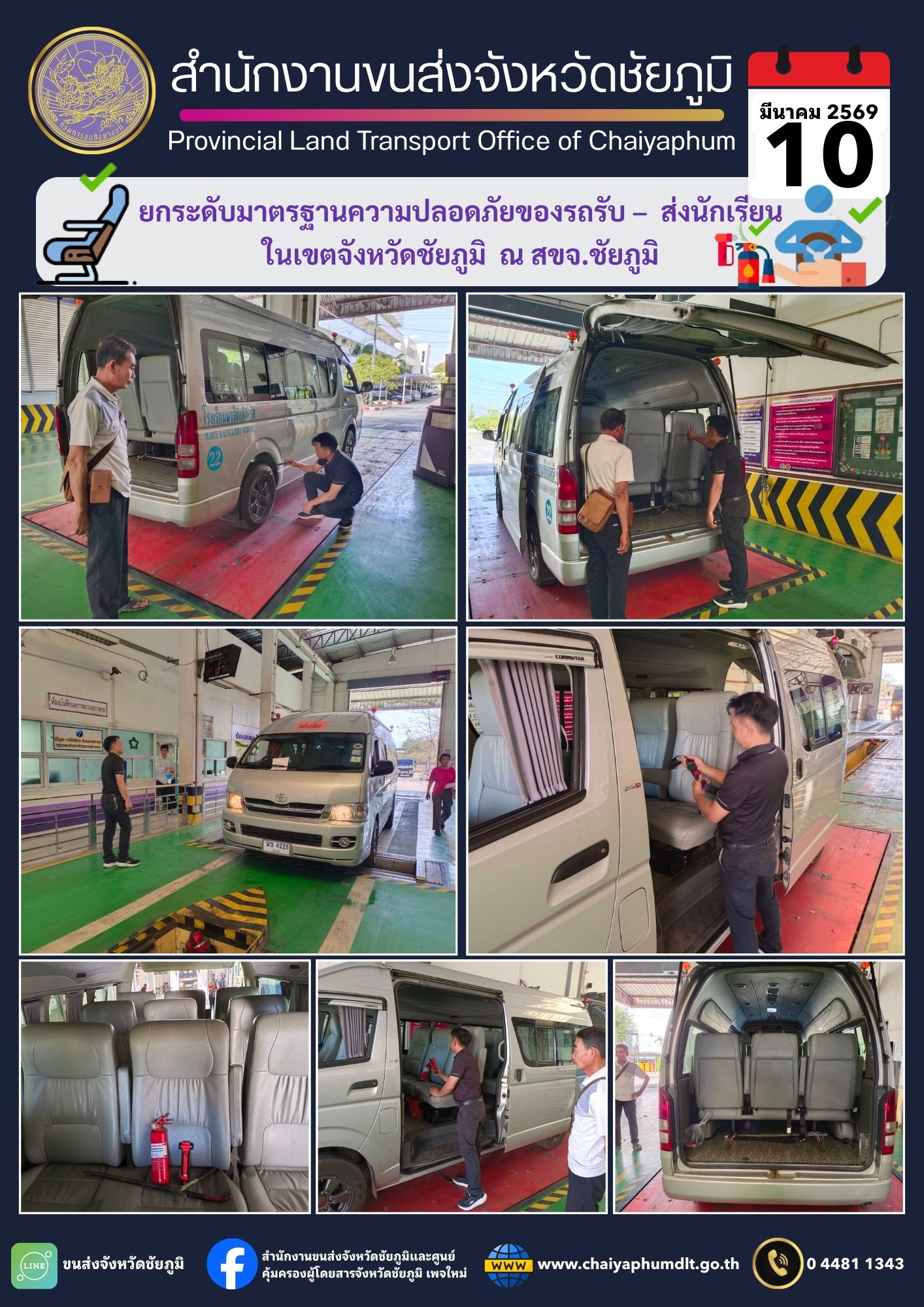 สำนักงานขนส่งจังหวัดชัยภูมิ โดย นายปริญญา หัสดินทร ณ อยุธยา ขนส่งจังหวัดชัยภูมิ มอบหมายให้เจ้าหน้าที่สำนักงานขนส่งจังหวัดชัยภูมิ และ สาขา ลงพื้นที่ออกประชาสัมพันธ์ในการยกระดับมาตรฐานความปลอดภัยของรถรับ – ส่งนักเรียนในเขตจังหวัดชัยภูมิ พร้อมทั้ง อำนวยความสะดวกแก่ผู้ประกอบการรถรับ-ส่งนักเรียน ในการนำรถเข้ารับการตรวจสภาพรถ ได้แก่ ระบบห้ามล้อ ระบบบังคับเลี้ยว เบาะที่นั่ง อุปกรณ์ส่วนควบ ความมั่นคงแข็งแรงของตัวรถ และอุปกรณ์ความปลอดภัยต่างๆ ณ ฝ่ายตรวจสภาพรถ สำนักงานขนส่งจังหวัดชัยภูมิ และสาขา