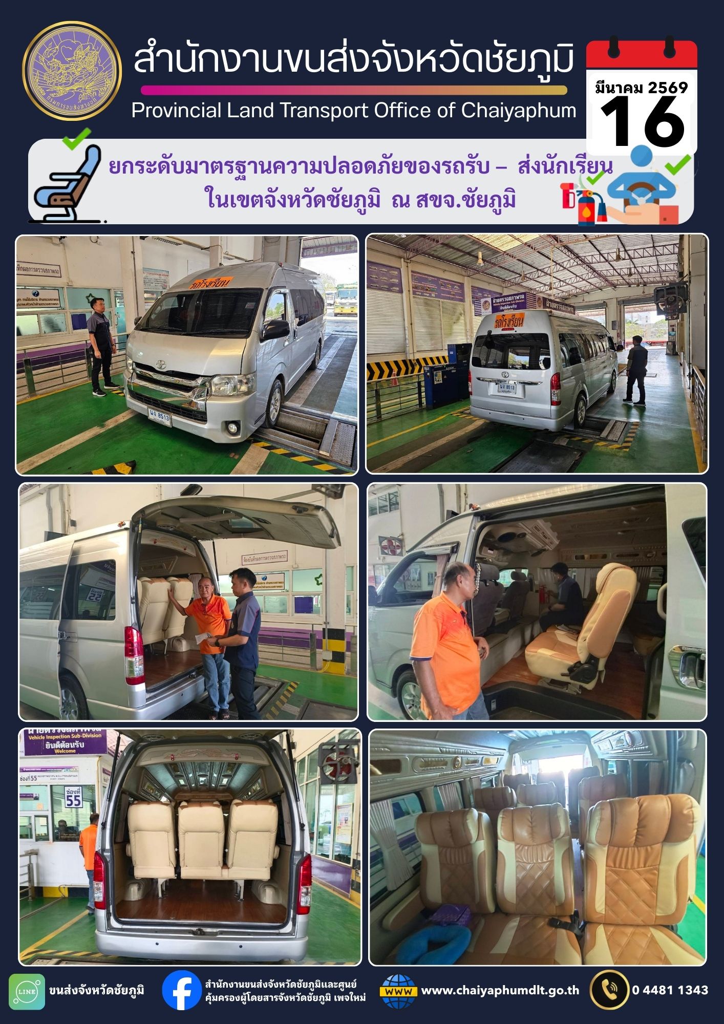 สำนักงานขนส่งจังหวัดชัยภูมิ โดย นายปริญญา หัสดินทร ณ อยุธยา ขนส่งจังหวัดชัยภูมิ มอบหมายให้เจ้าหน้าที่สำนักงานขนส่งจังหวัดชัยภูมิ และ สาขา ลงพื้นที่ออกประชาสัมพันธ์ในการยกระดับมาตรฐานความปลอดภัยของรถรับ – ส่งนักเรียนในเขตจังหวัดชัยภูมิ พร้อมทั้ง อำนวยความสะดวกแก่ผู้ประกอบการรถรับ-ส่งนักเรียน ในการนำรถเข้ารับการตรวจสภาพรถ ได้แก่ ระบบห้ามล้อ ระบบบังคับเลี้ยว เบาะที่นั่ง อุปกรณ์ส่วนควบ ความมั่นคงแข็งแรงของตัวรถ และอุปกรณ์ความปลอดภัยต่างๆ ณ ฝ่ายตรวจสภาพรถ สำนักงานขนส่งจังหวัดชัยภูมิ และสาขา