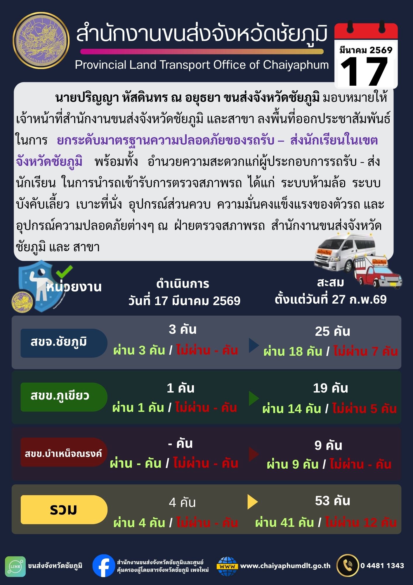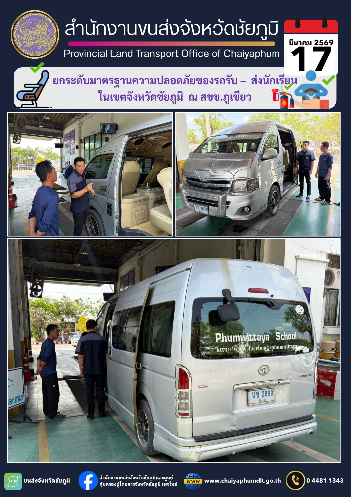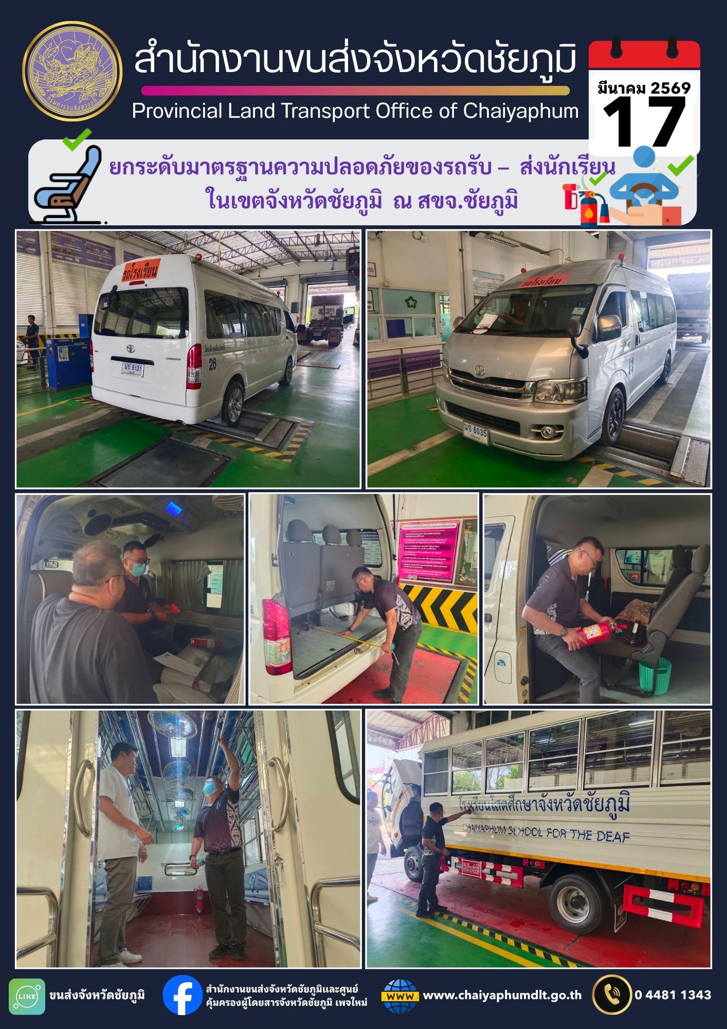 สำนักงานขนส่งจังหวัดชัยภูมิ โดย นายปริญญา หัสดินทร ณ อยุธยา ขนส่งจังหวัดชัยภูมิ มอบหมายให้เจ้าหน้าที่สำนักงานขนส่งจังหวัดชัยภูมิ และ สาขา ลงพื้นที่ออกประชาสัมพันธ์ในการยกระดับมาตรฐานความปลอดภัยของรถรับ – ส่งนักเรียนในเขตจังหวัดชัยภูมิ พร้อมทั้ง อำนวยความสะดวกแก่ผู้ประกอบการรถรับ-ส่งนักเรียน ในการนำรถเข้ารับการตรวจสภาพรถ ได้แก่ ระบบห้ามล้อ ระบบบังคับเลี้ยว เบาะที่นั่ง อุปกรณ์ส่วนควบ ความมั่นคงแข็งแรงของตัวรถ และอุปกรณ์ความปลอดภัยต่างๆ ณ ฝ่ายตรวจสภาพรถ สำนักงานขนส่งจังหวัดชัยภูมิ และสาขา