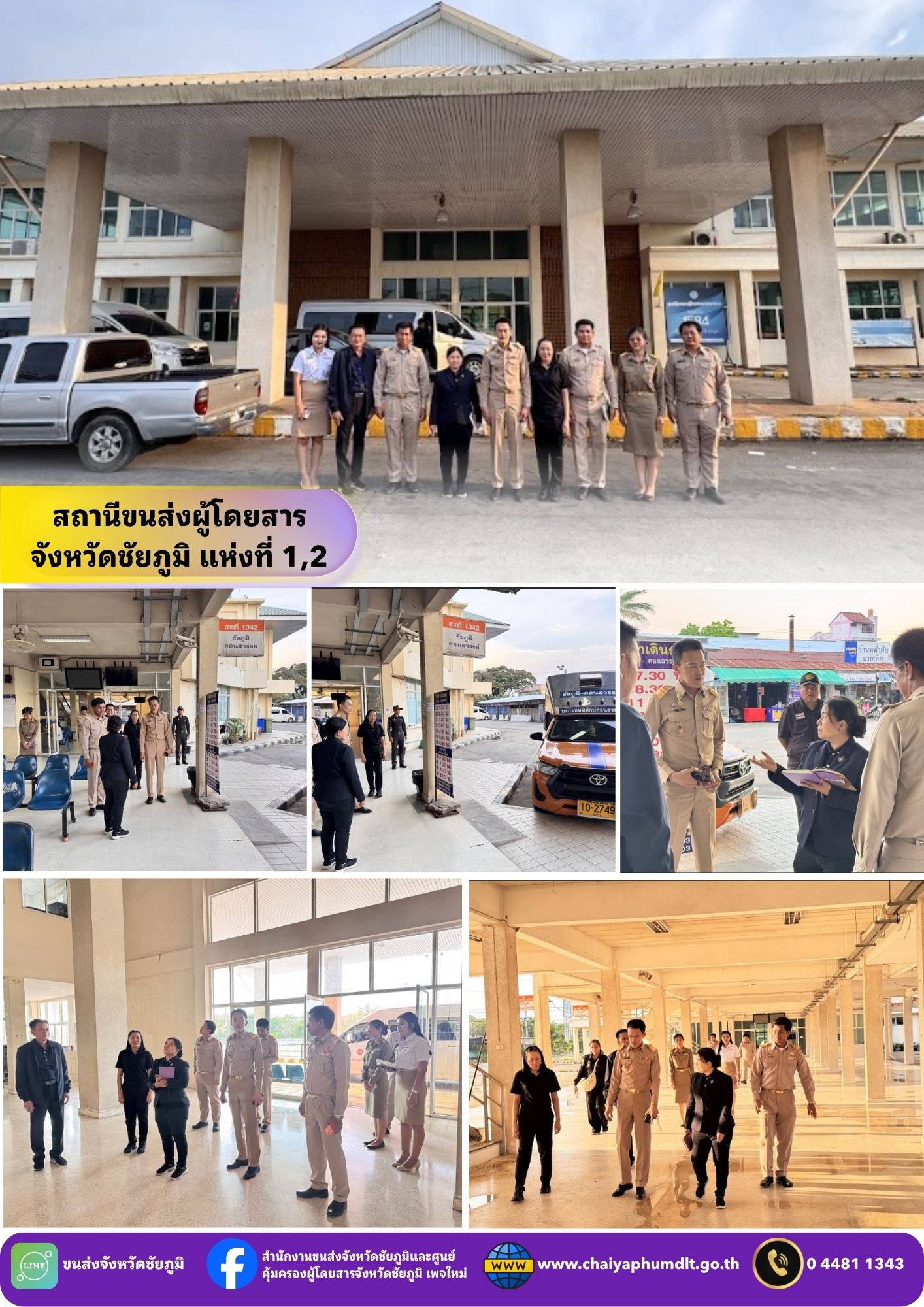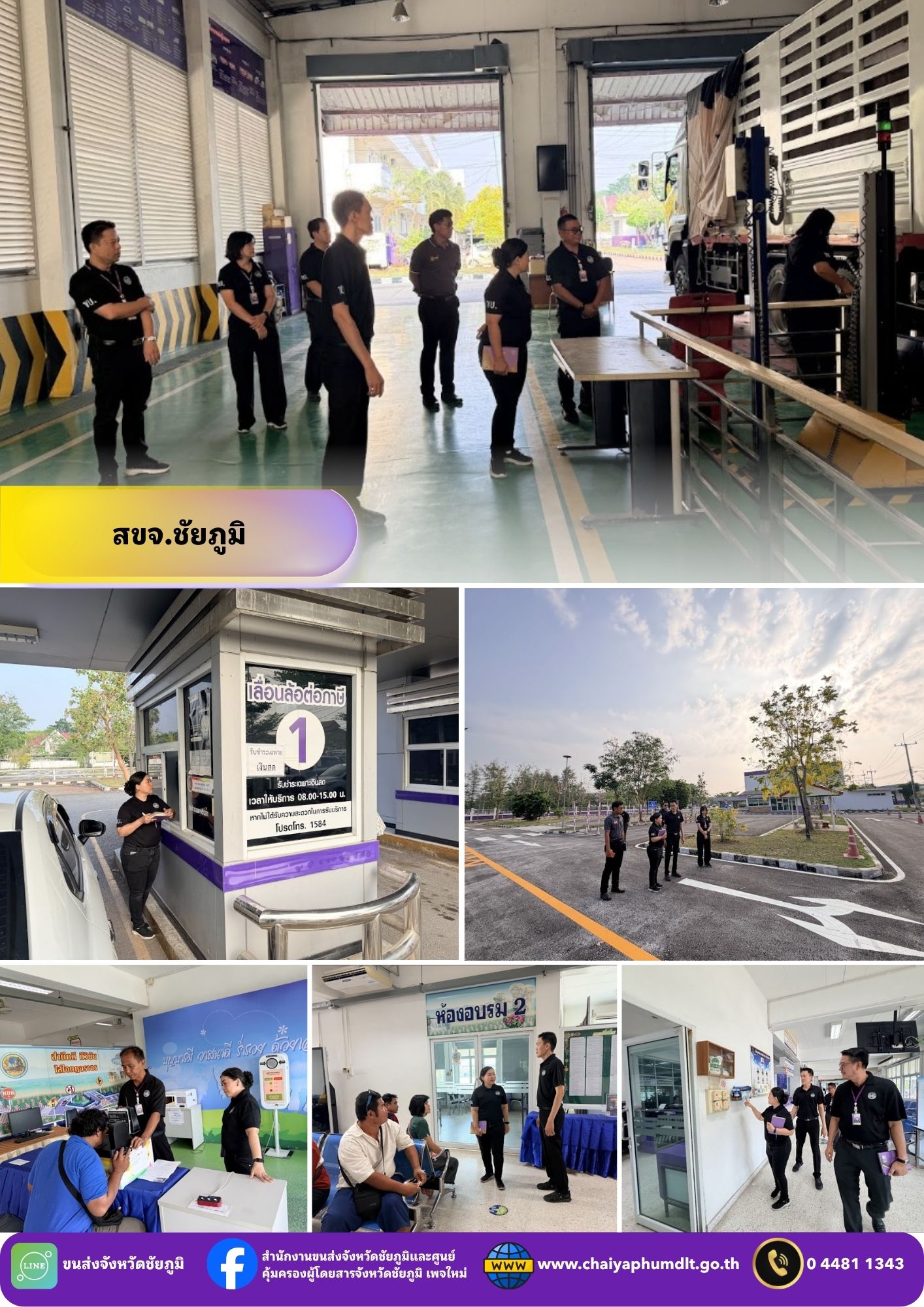 วันที่ 23 – 24 มีนาคม 2569 นางสาวสุกัญญา หมีบังเกิด ผู้ตรวจราชการ กรมการขนส่งทางบก ประจำเขตตรวจราชการที่ 13 เดินทางมาตรวจราชการ ณ สำนักงานขนส่งจังหวัดชัยภูมิ และ สาขา เพื่อติดตามผลการปฏิบัติงานตามแผนการตรวจราชการกรณีปกติ ประจำปีงบประมาณ พ.ศ. 2569 โดยมี นายปริญญา หัสดินทร ณ อยุธยา ขนส่งจังหวัดชัยภูมิ และเจ้าหน้าที่สำนักงานขนส่งจังหวัดชัยภูมิ ให้การต้อนรับ และ รายงานผลการดำเนินงานตามภารกิจที่ได้รับมอบหมาย พร้อมรับข้อเสนอแนะ และ แนวทางการพัฒนาการปฏิบัติงานให้เป็นไปตามนโยบายและมาตรฐานของกรมการขนส่งทางบกอย่างเคร่งครัด