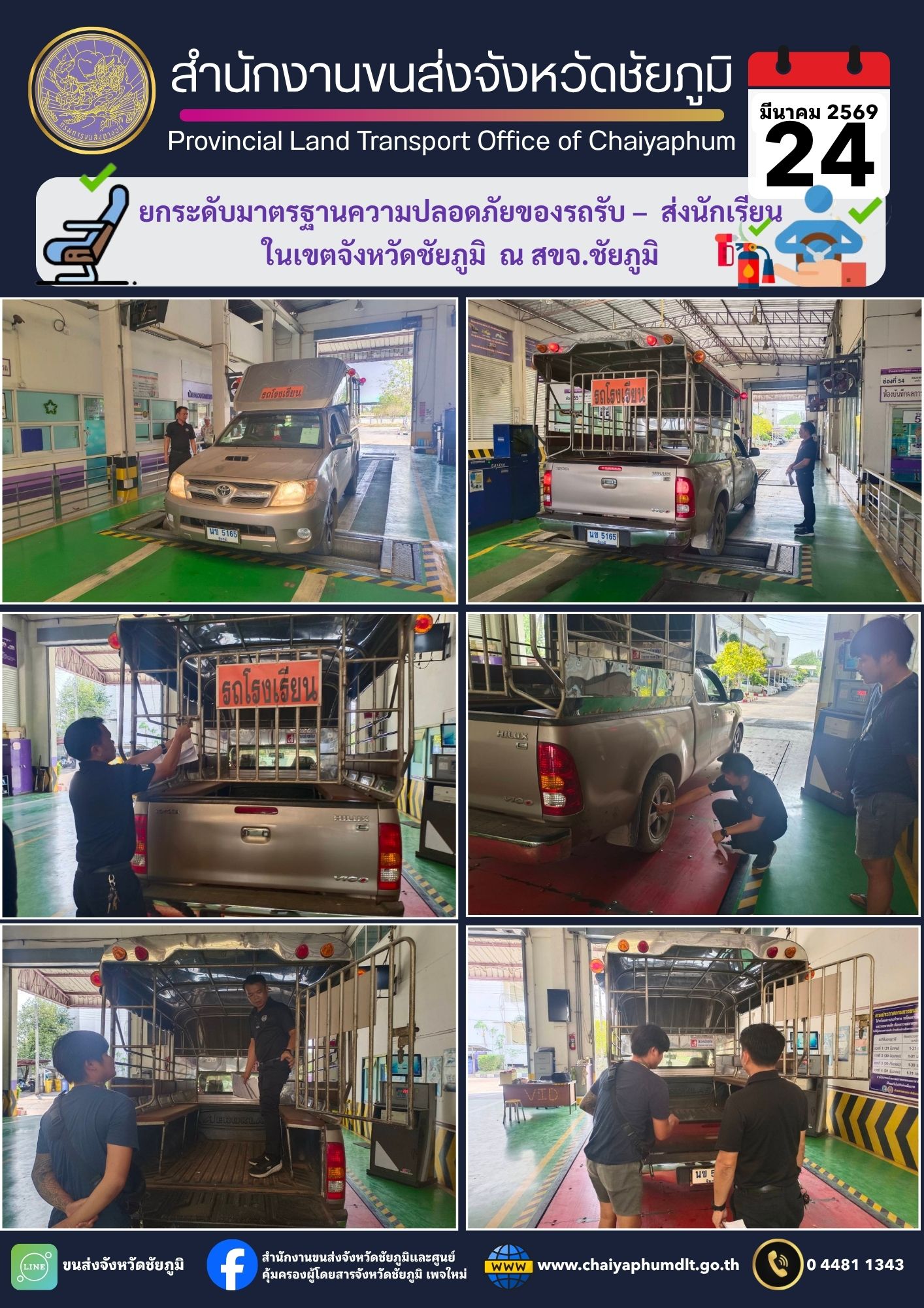 สำนักงานขนส่งจังหวัดชัยภูมิ โดย นายปริญญา หัสดินทร ณ อยุธยา ขนส่งจังหวัดชัยภูมิ มอบหมายให้เจ้าหน้าที่สำนักงานขนส่งจังหวัดชัยภูมิ และ สาขา ลงพื้นที่ออกประชาสัมพันธ์ในการยกระดับมาตรฐานความปลอดภัยของรถรับ – ส่งนักเรียนในเขตจังหวัดชัยภูมิ พร้อมทั้ง อำนวยความสะดวกแก่ผู้ประกอบการรถรับ-ส่งนักเรียน ในการนำรถเข้ารับการตรวจสภาพรถ ได้แก่ ระบบห้ามล้อ ระบบบังคับเลี้ยว เบาะที่นั่ง อุปกรณ์ส่วนควบ ความมั่นคงแข็งแรงของตัวรถ และอุปกรณ์ความปลอดภัยต่างๆ ณ ฝ่ายตรวจสภาพรถ สำนักงานขนส่งจังหวัดชัยภูมิ และสาขา