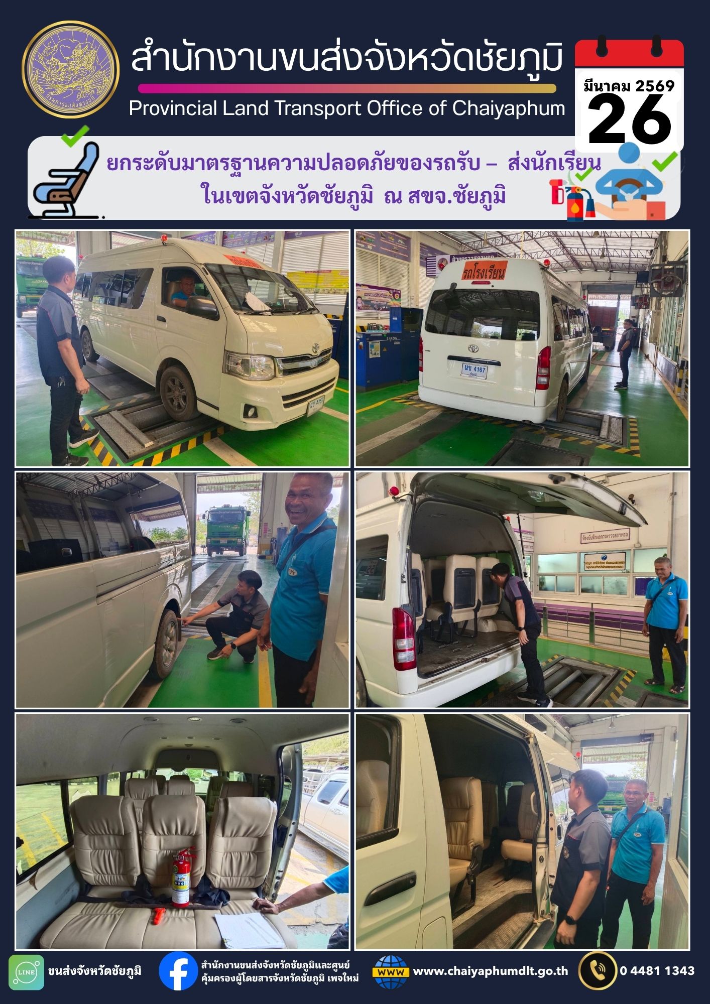 สำนักงานขนส่งจังหวัดชัยภูมิ โดย นายปริญญา หัสดินทร ณ อยุธยา ขนส่งจังหวัดชัยภูมิ มอบหมายให้เจ้าหน้าที่สำนักงานขนส่งจังหวัดชัยภูมิ และ สาขา ลงพื้นที่ออกประชาสัมพันธ์ในการยกระดับมาตรฐานความปลอดภัยของรถรับ – ส่งนักเรียนในเขตจังหวัดชัยภูมิ พร้อมทั้ง อำนวยความสะดวกแก่ผู้ประกอบการรถรับ-ส่งนักเรียน ในการนำรถเข้ารับการตรวจสภาพรถ ได้แก่ ระบบห้ามล้อ ระบบบังคับเลี้ยว เบาะที่นั่ง อุปกรณ์ส่วนควบ ความมั่นคงแข็งแรงของตัวรถ และอุปกรณ์ความปลอดภัยต่างๆ ณ ฝ่ายตรวจสภาพรถ สำนักงานขนส่งจังหวัดชัยภูมิ และสาขา