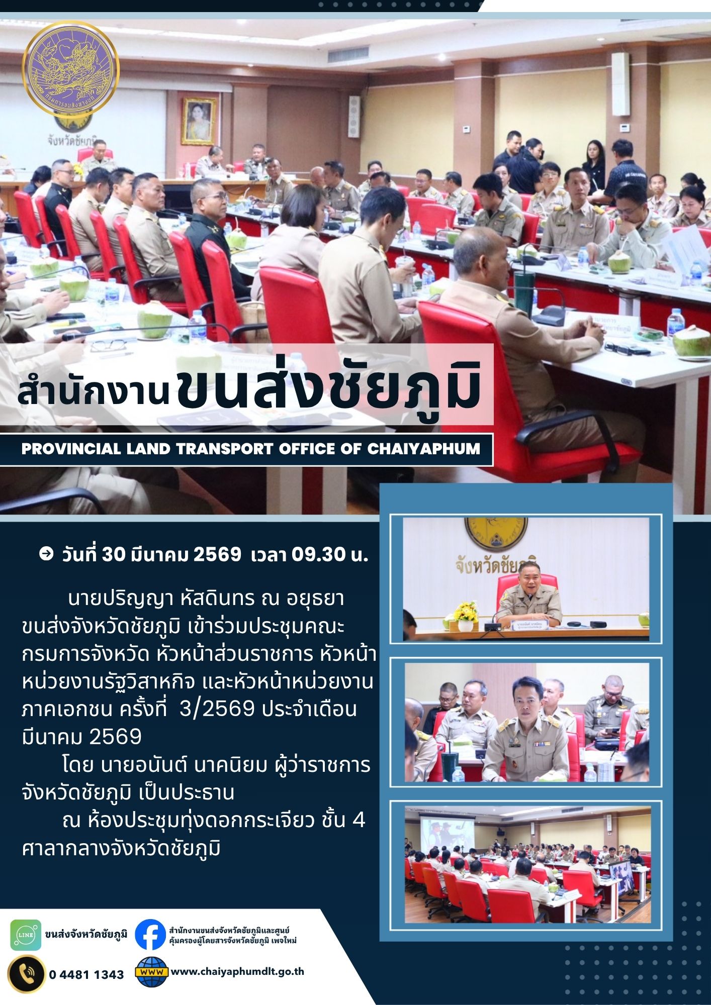 สำนักงานขนส่งจังหวัดชัยภูมิ โดย นายปริญญา หัสดินทร ณ อยุธยา ขนส่งจังหวัดชัยภูมิ เข้าร่วมประชุมคณะกรมการจังหวัด หัวหน้าส่วนราชการ หัวหน้าหน่วยงานรัฐวิสาหกิจ และหัวหน้าหน่วยงานภาคเอกชน ครั้งที่ 3/2569 ประจำเดือน มีนาคม 2569 โดย นายอนันต์ นาคนิยม ผู้ว่าราชการจังหวัดชัยภูมิ เป็นประธาน ณ ห้องประชุมทุ่งดอกกระเจียว ชั้น 4 ศาลากลางจังหวัดชัยภูมิ
