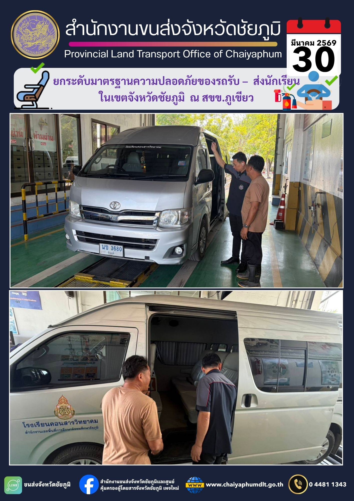 สำนักงานขนส่งจังหวัดชัยภูมิ โดย นายปริญญา หัสดินทร ณ อยุธยา ขนส่งจังหวัดชัยภูมิ มอบหมายให้เจ้าหน้าที่สำนักงานขนส่งจังหวัดชัยภูมิ และ สาขา ลงพื้นที่ออกประชาสัมพันธ์ในการยกระดับมาตรฐานความปลอดภัยของรถรับ – ส่งนักเรียนในเขตจังหวัดชัยภูมิ พร้อมทั้ง อำนวยความสะดวกแก่ผู้ประกอบการรถรับ-ส่งนักเรียน ในการนำรถเข้ารับการตรวจสภาพรถ ได้แก่ ระบบห้ามล้อ ระบบบังคับเลี้ยว เบาะที่นั่ง อุปกรณ์ส่วนควบ ความมั่นคงแข็งแรงของตัวรถ และอุปกรณ์ความปลอดภัยต่างๆ ณ ฝ่ายตรวจสภาพรถ สำนักงานขนส่งจังหวัดชัยภูมิ และสาขา