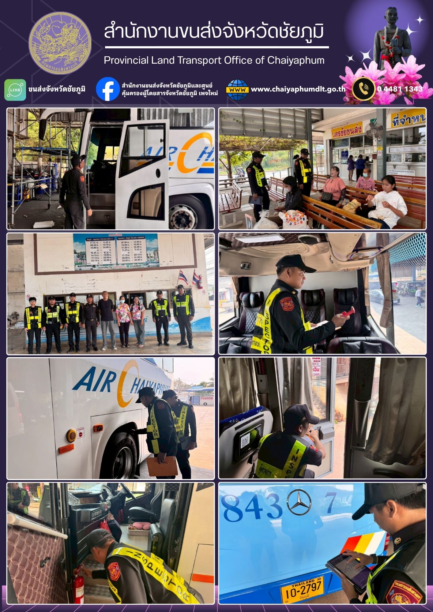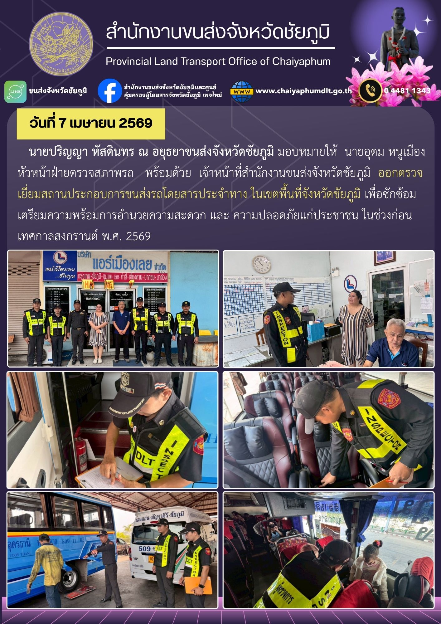 สำนักงานขนส่งจังหวัดชัยภูมิ โดย นายปริญญา หัสดินทร ณ อยุธยาขนส่งจังหวัดชัยภูมิ มอบหมายให้ นายอุดม หนูเมือง หัวหน้าฝ่ายตรวจสภาพรถ พร้อมด้วยเจ้าหน้าที่สำนักงานขนส่งจังหวัดชัยภูมิ ออกตรวจเยี่ยมสถานประกอบการขนส่งรถโดยสารประจำทาง ในเขตพื้นที่จังหวัดชัยภูมิ เพื่อซักซ้อมเตรียมความพร้อมการอำนวยความสะดวกและความปลอดภัยแก่ประชาชน ในช่วงก่อนเทศกาลสงกรานต์ พ.ศ. 2569