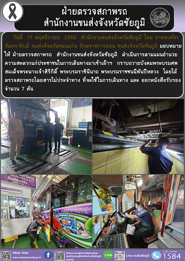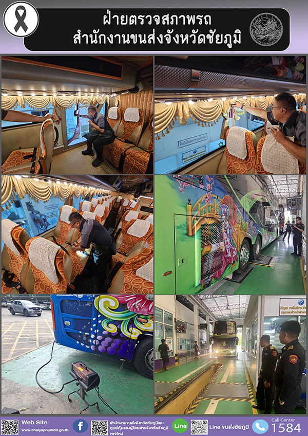 สำนักงานขนส่งจังหวัดชัยภูมิ โดย นายพงศ์ธร จันทราธิบดี ขนส่งจังหวัดขอนแก่น รักษราชการแทน ขนส่งจังหวัดชัยภูมิ มอบหมายให้ ฝ่ายตรวจสภาพรถ สำนักงานขนส่งจังหวัดชัยภูมิ ดำเนินการตามแผนอำนวยความสะดวกแก่ประชาชนในการเดินทางมาเข้าเฝ้าฯ กราบถวายบังคมพระบรมศพ สมเด็จพระนางเจ้าสิริกิติ์ พระบรมราชินีนาถ พระบรมราชชนนีพันปีหลวง โดยได้ตรวจสภาพรถโดยสารไม่ประจำทาง ที่จะใช้ในการเดินทาง และ ออกหนังสือรับรอง