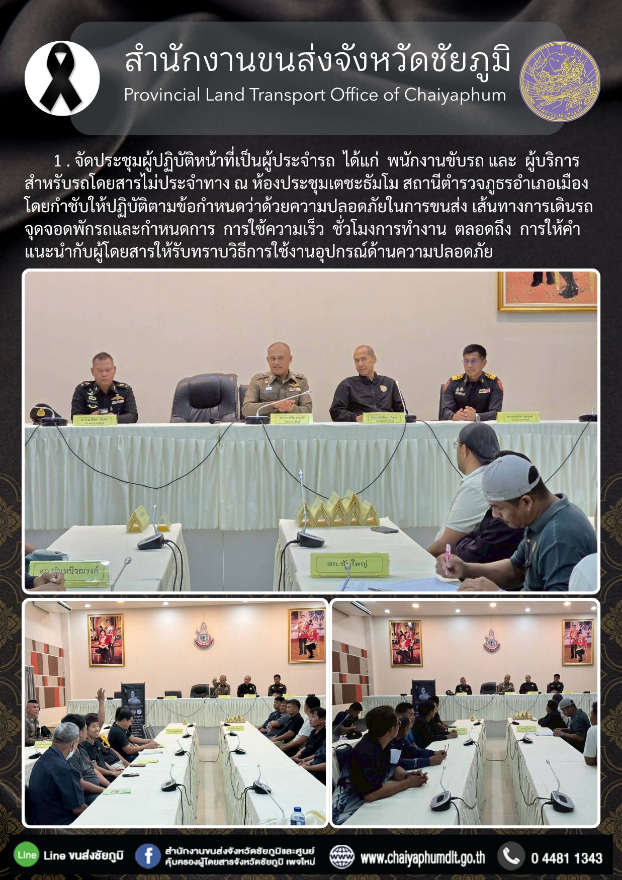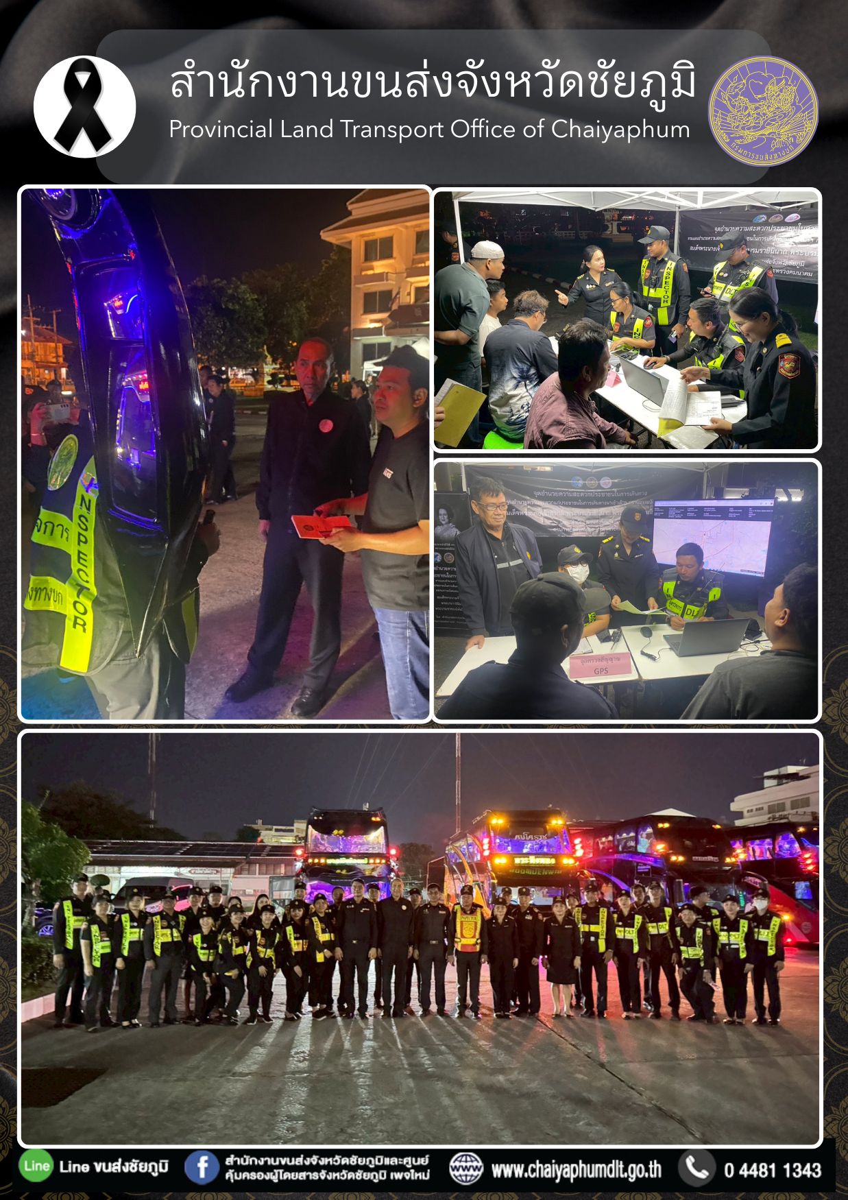 วันที่ 18 พฤศจิกายน 2568 เวลา 22.00 น. นายอนันต์ นาคนิยม ผู้ว่าราชการจังหวัดชัยภูมิ เป็นประธานในการปล่อยขบวนรถ ในการเดินทางมาเข้าเฝ้าฯ กราบถวายบังคมพระบรมศพ สมเด็จพระนางเจ้าสิริกิติ์ พระบรมราชินีนาถ พระบรมราชชนนีพันปีหลวง ณ บริเวณจุดปล่อยรถสถานีตำรวจภูธรเมืองชัยภูมิ ในการนี้ สำนักงานขนส่งจังหวัดชัยภูมิ โดย นายพงศ์ธร จันทราธิบดี ขนส่งจังหวัดขอนแก่น รักษาราชการแทน ขนส่งจังหวัดชัยภูมิ พร้อมด้วยเจ้าหน้าที่สำนักงานขนส่งจังหวัดชัยภูมิ ดำเนินการตามแผนอำนวยความสะดวกแก่ประชาชนในการเดินทางมาเข้าเฝ้าฯ กราบถวายบังคมพระบรมศพ สมเด็จพระนางเจ้าสิริกิติ์ พระบรมราชินีนาถ พระบรมราชชนนีพันปีหลวง ร่วมกับ ที่ทำการปกครองจังหวัดชัยภูมิ สถานีตำรวจภูธรอำเภอเมือง และสำนักงานสาธารณสุขจังหวัดชัยภูมิ โดยได้ดำเนินการ ดังนี้