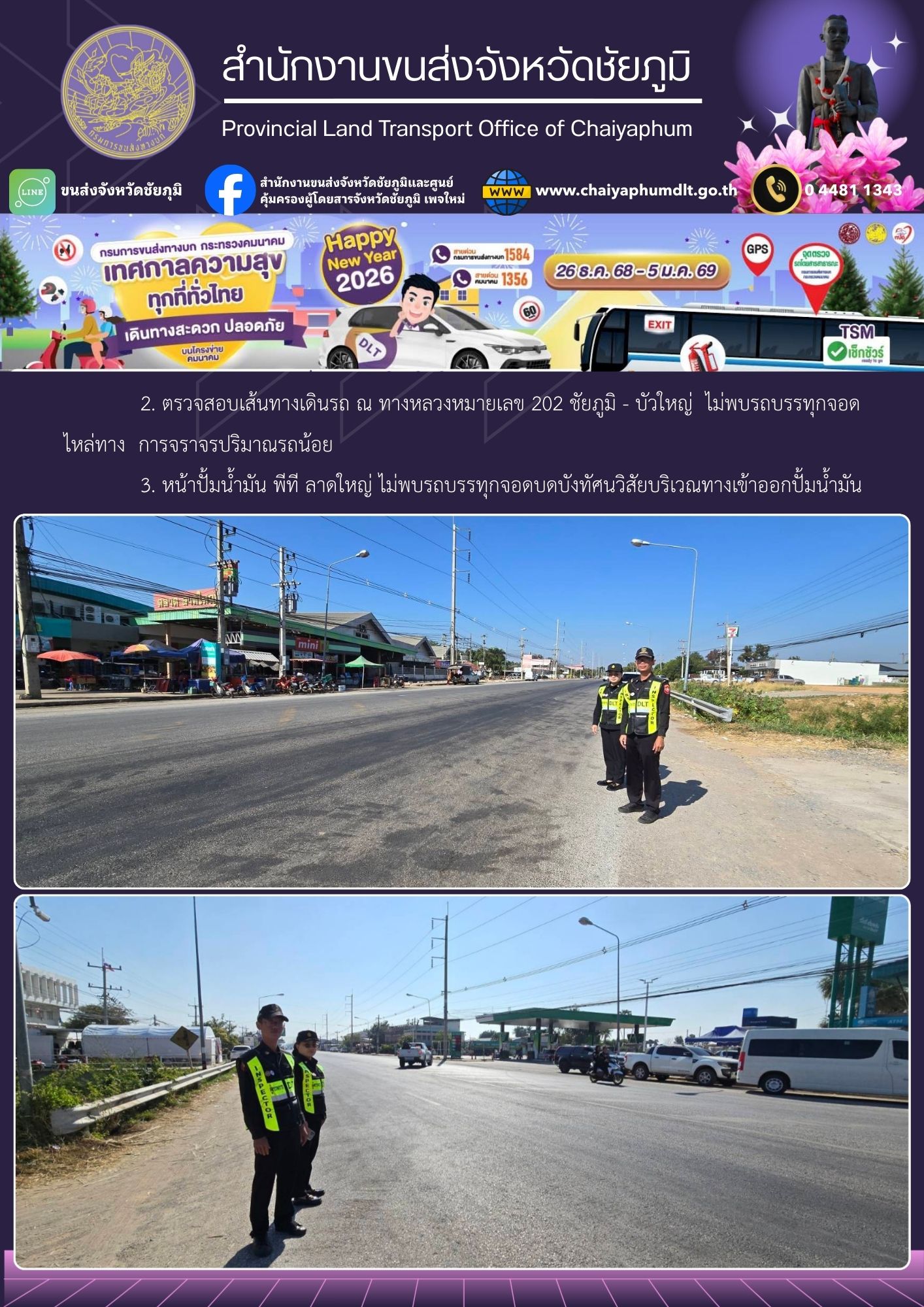 สำนักงานขนส่งจังหวัดชัยภูมิ โดย นายพงศ์ธร จันทราธิบดี ขนส่งจังหวัดขอนแก่น รักษาราชการแทน ขนส่งจังหวัดชัยภูมิ  ได้มอบหมายให้ผู้ตรวจการชุดเคลื่อนที่เฉพาะกิจ ดำเนินการตามแผนอำนวยความสะดวกและความปลอดภัย รองรับการเดินทางของประชาชน ประชาชน ในช่วงเทศกาลปีใหม่ 2569 ระหว่างวันที่ 26 ธันวาคม 2568 – 5 มกราคม 2569