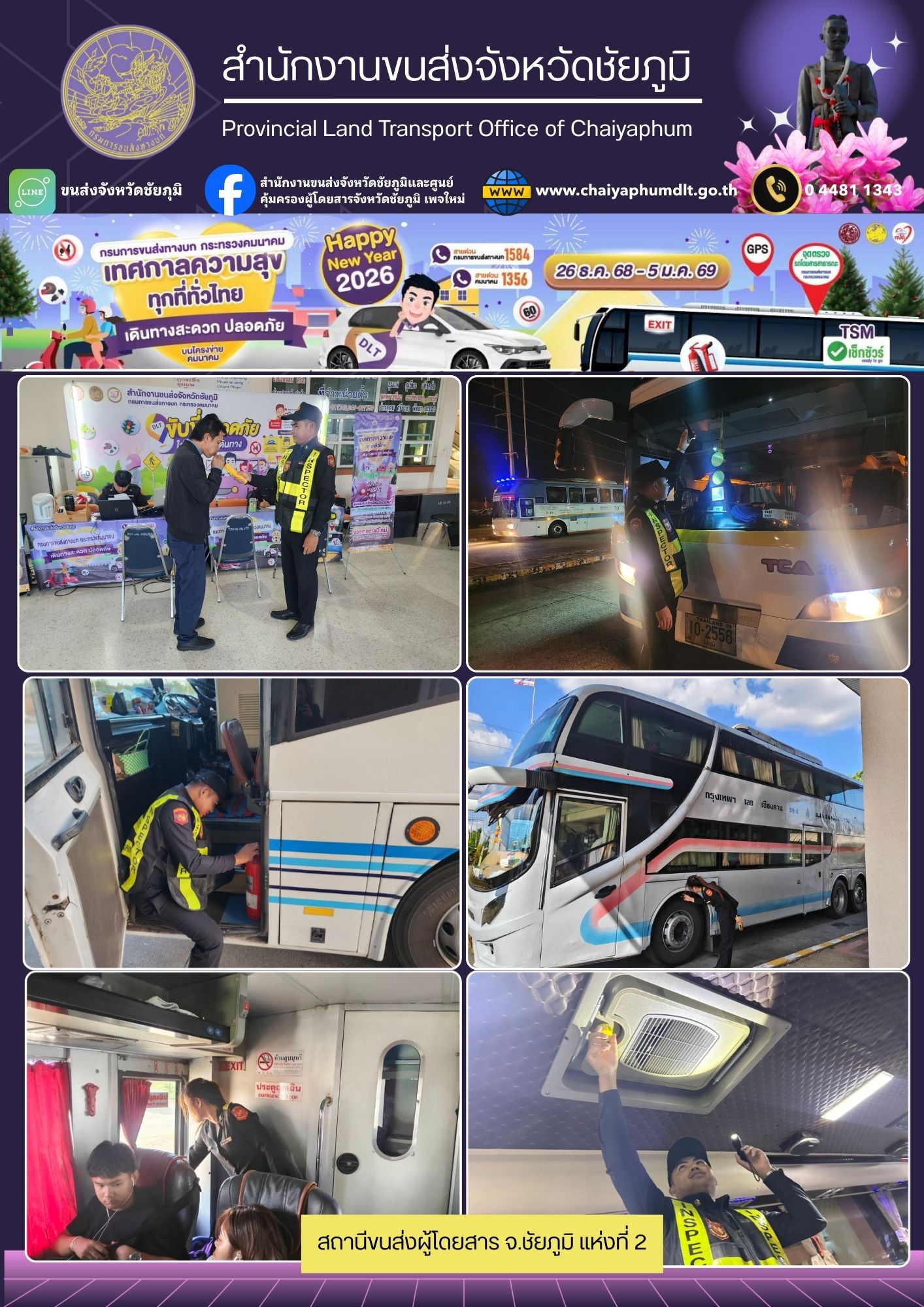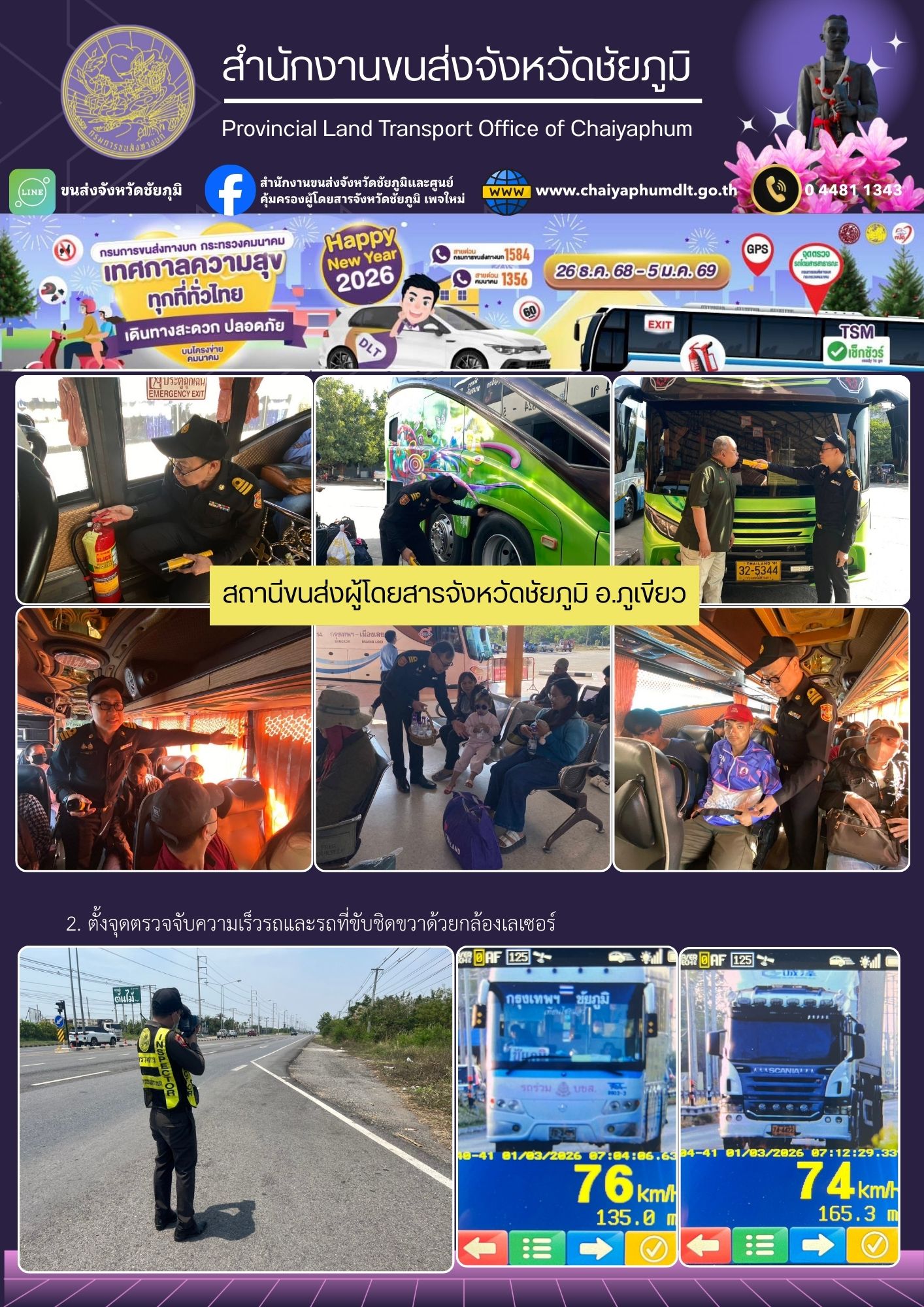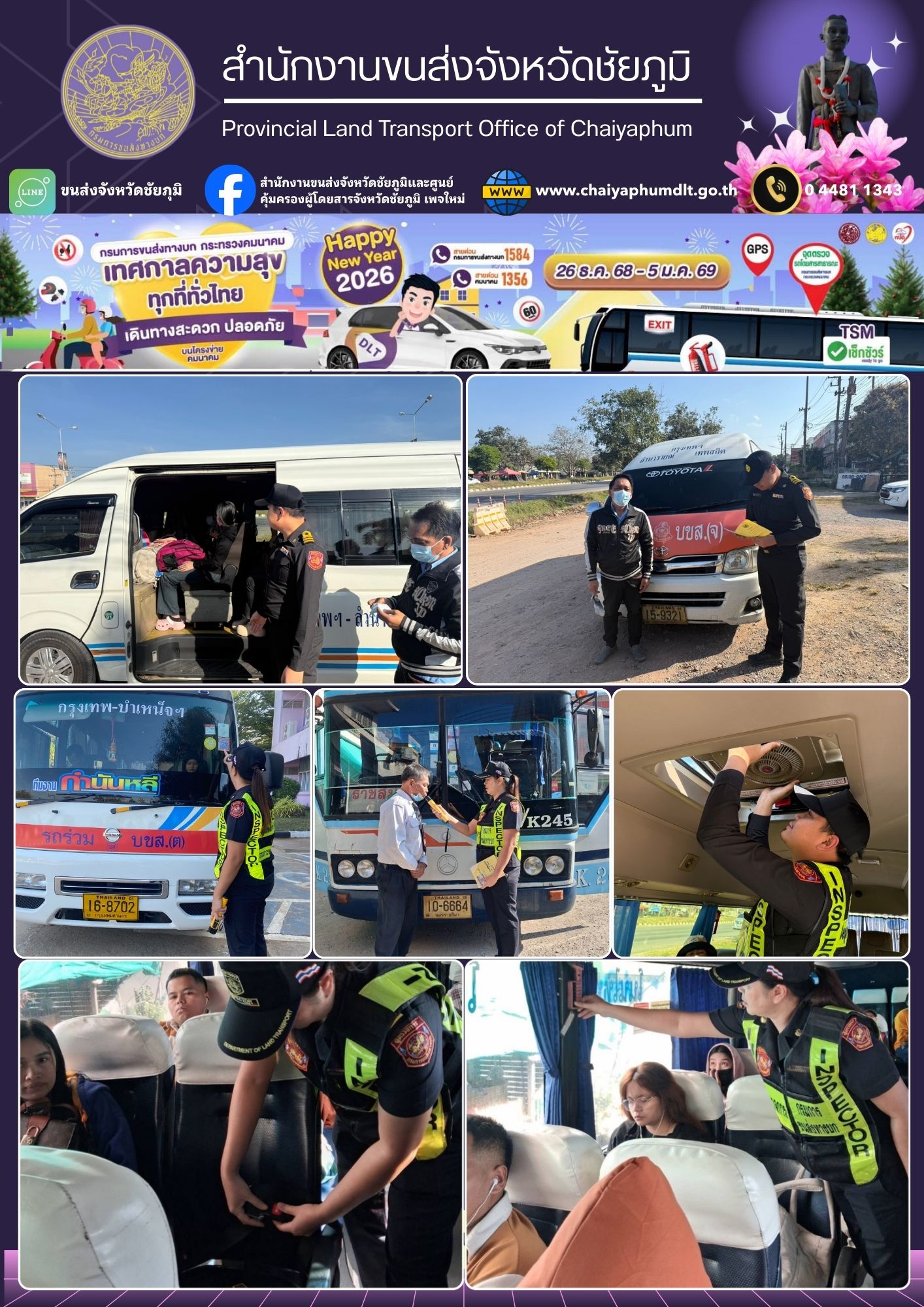 สำนักงานขนส่งจังหวัดชัยภูมิ โดย นายพงศ์ธร จันทราธิบดี ขนส่งจังหวัดขอนแก่น รักษาราชการแทน ขนส่งจังหวัดชัยภูมิ มอบหมายให้ผู้ตรวจการ และ เจ้าหน้าที่ สำนักงานขนส่งจังหวัดชัยภูมิ ดำเนินการตามแผนอำนวยความสะดวกและความปลอดภัย รองรับการเดินทางของประชาชน ในช่วงเทศกาลปีใหม่ 2569 ระหว่างวันที่ 26 ธันวาคม 2568 – 5 มกราคม 2569