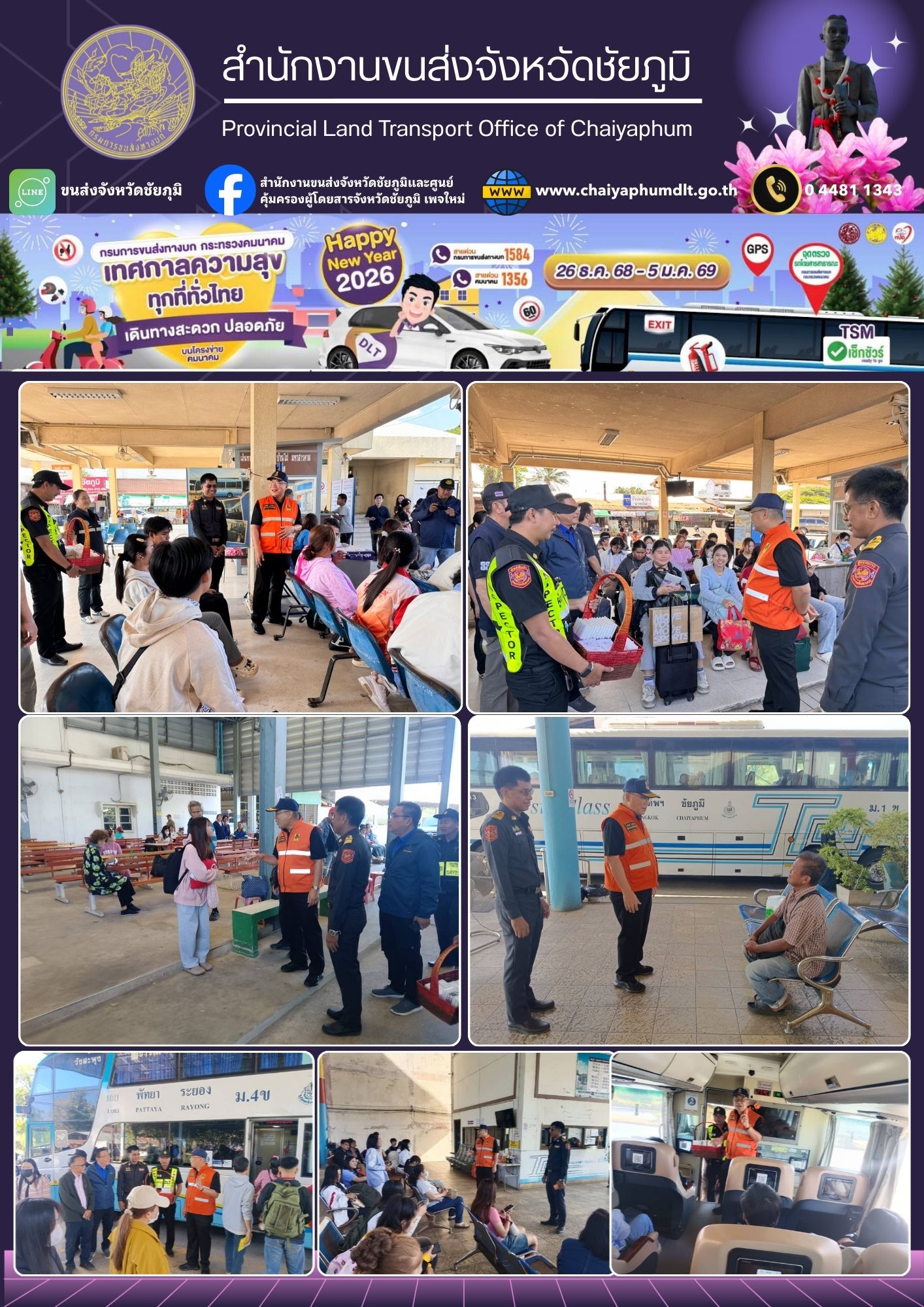 นายอนันต์ นาคนิยม ผู้ว่าราชการจังหวัดชัยภูมิ พร้อมด้วยหัวหน้าส่วนราชการ คณะกรรมการศูนย์อำนวยความสะดวกและปลอดภัยทางถนนจังหวัด และเจ้าหน้าที่ที่เกี่ยวข้อง ลงพื้นที่ตรวจเยี่ยมและให้กำลังใจประชาชนที่มารอขึ้นรถโดยสารเพื่อเดินทางกลับไปทำงานยังกรุงเทพฯ และจังหวัดต่างๆ ในช่วงสิ้นสุดเทศกาลปีใหม่ 2569 ณ สถานีขนส่งผู้โดยสารจังหวัดชัยภูมิ แห่งที่ 1 และ จุดจอดรถโดยสารสาธรณะของผู้ประกอบการขนส่ง โดยมี นายธีรยุทธ ดวงมณี ประชาสัมพันธ์จังหวัดชัยภูมิ และ จ่าเอกโชติวงศ์ ทะมาดี หัวหน้ากลุ่มวิชาการขนส่ง รักษาราชการแทน ขนส่งจังหวัดชัยภูมิ ร่วมให้การต้อนรับและรายงานผลการดำเนินงาน