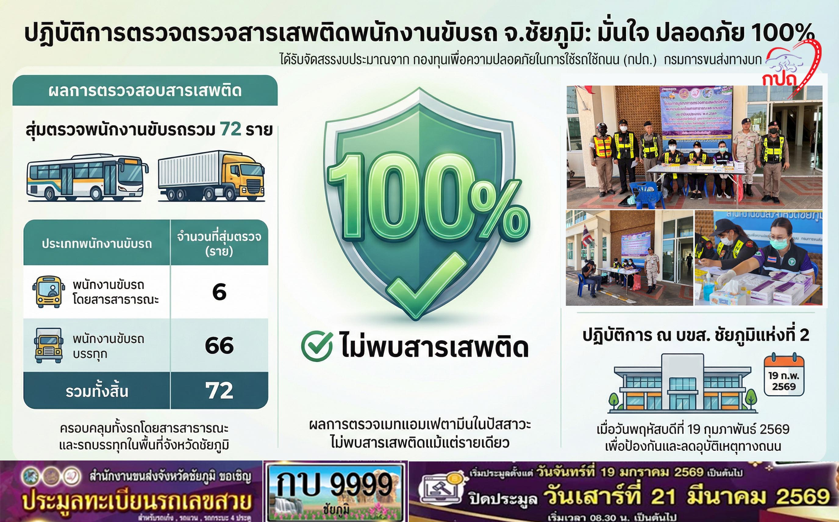 สำนักงานขนส่งจังหวัดชัยภูมิ โดย นายปริญญา หัสดินทร ณ อยุธยาขนส่งจังหวัดชัยภูมิ ได้มอบหมายให้ผู้ตรวจการขนส่งตั้งจุดตรวจสอบสารเสพติดให้โทษ (เมทแอมเฟตามีน) ในปัสสาวะของพนักงานขับรถโดยสารสาธารณะและรถบรรทุก เพื่อป้องกันและลดอุบัติเหตุทางถนน ณ บริเวณถนนด้านหน้าสถานีขนส่งผู้โดยสารจังหวัดชัยภูมิ แห่งที่ 2 โดยบูรณาการร่วมกับหน่วยงานที่เกี่ยวข้องในจังหวัดชัยภูมิ ได้แก่ กอ.รมน., ตำรวจ, ปกครอง, สาธารณสุข และเทศบาลเมืองชัยภูมิ