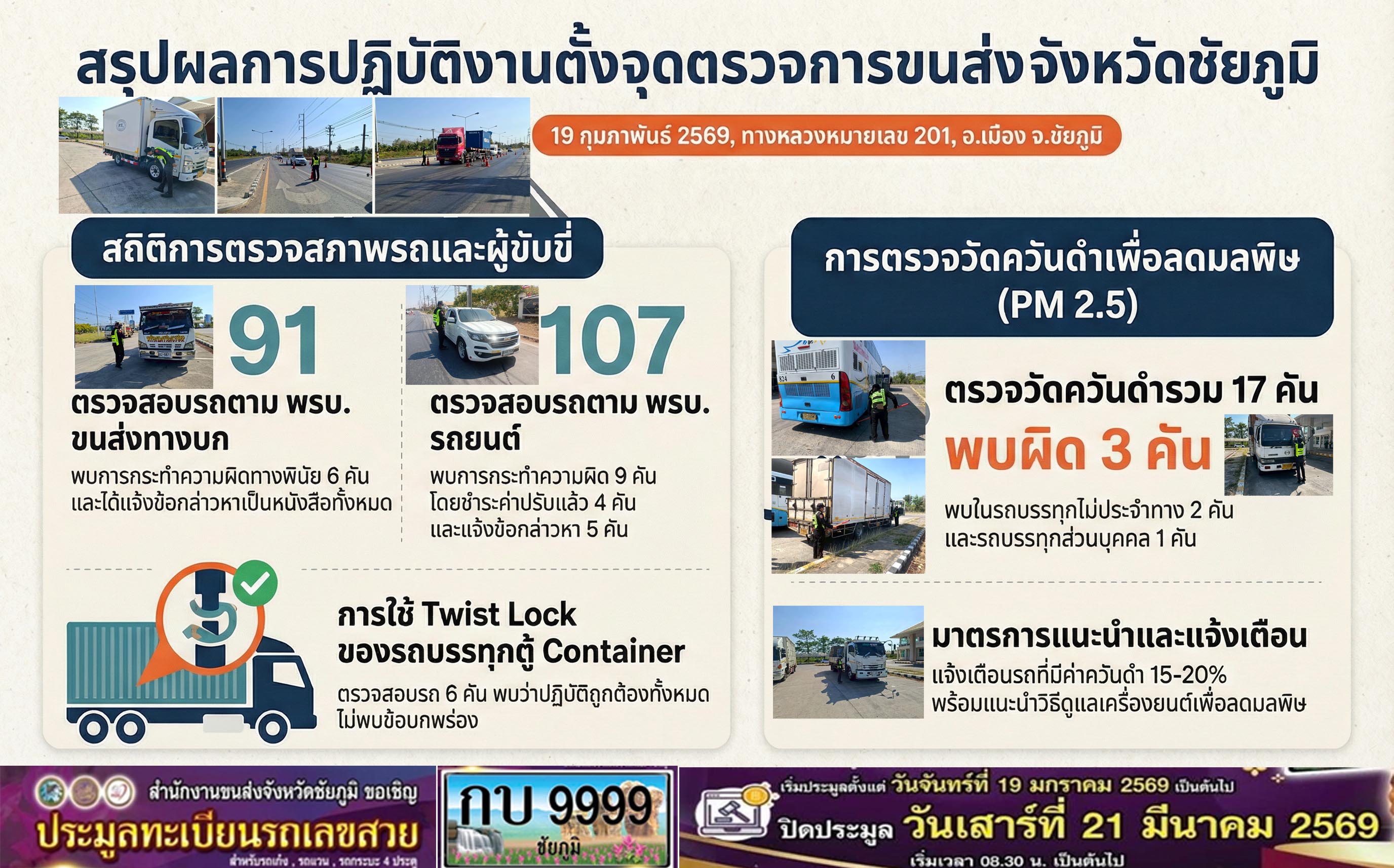 สำนักงานขนส่งจังหวัดชัยภูมิ โดย นายปริญญา หัสดินทร ณ อยุธยา ขนส่งจังหวัดชัยภูมิ ได้มอบหมายให้ผู้ตรวจการตั้งจุดตรวจการขนส่ง ตั้งจุดตรวจสอบ ตรวจสอบรถ/คนขับรถตามกฎหมายว่าด้วยการขนส่งทางบก และ ตรวจสอบรถ/คนขับรถตามกฎหมายว่าด้วยรถยนต์