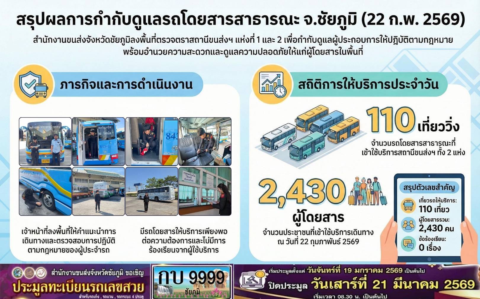 สำนักงานขนส่งจังหวัดชัยภูมิ ดำเนินการกำกับ ดูแล การจัดการเดินรถโดยสารสาธารณะ ณ สถานีขนส่งผู้โดยสารจังหวัดชัยภูมิ  เพื่อให้ผู้ประกอบการขนส่ง และผู้ประจำรถปฏิบัติตามกฎหมาย รวมทั้งดูแลอำนวยความสะดวก ให้คำแนะนำในการเดินทาง และดูแลความปลอดภัยให้แก่ผู้โดยสารที่เข้าใช้บริการสถานีขนส่งผู้โดยสาร สถานการณ์โดยรวมเหตุการณ์ปกติ มีรถโดยสารให้บริการประชาชนเพียงพอ และไม่มีเรื่องร้องเรียนเกี่ยวกับรถโดยสารสาธารณะ