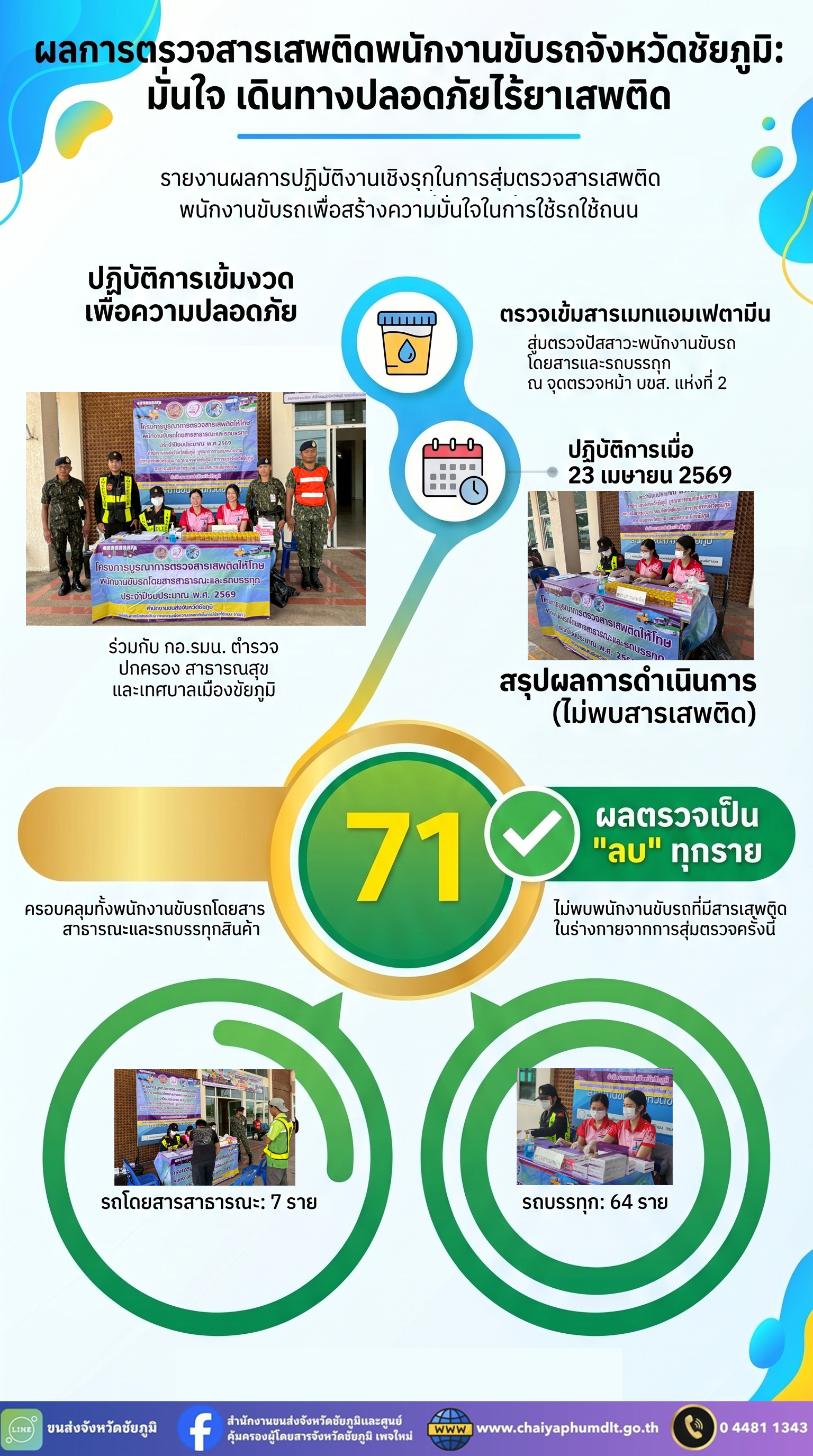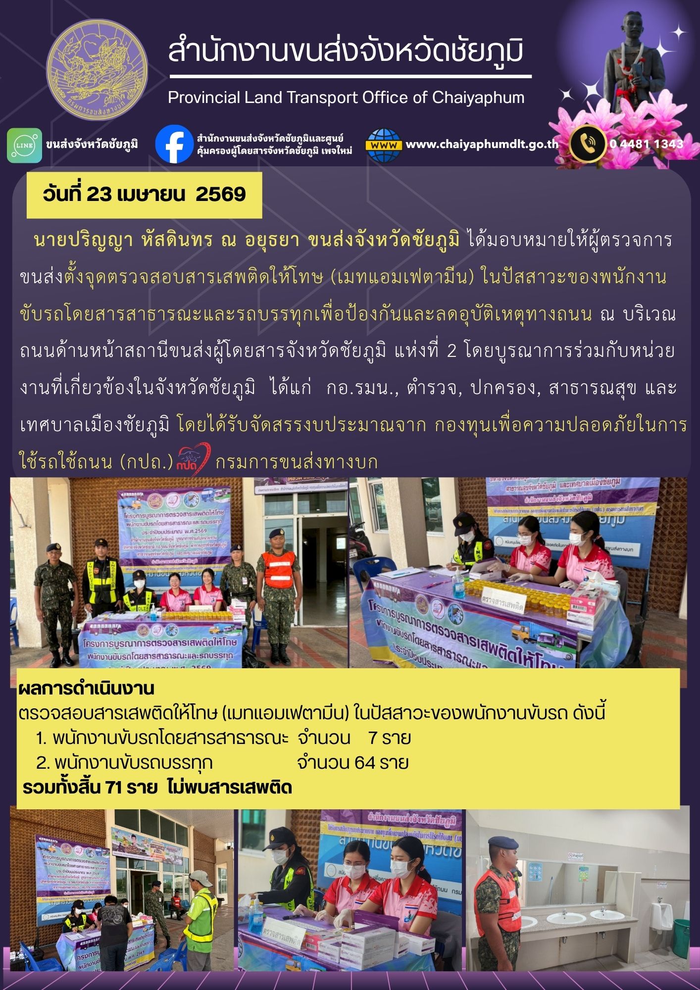สำนักงานขนส่งจังหวัดชัยภูมิ โดย นายปริญญา หัสดินทร ณ อยุธยาขนส่งจังหวัดชัยภูมิ ได้มอบหมายให้ผู้ตรวจการขนส่งตั้งจุดตรวจสอบสารเสพติดให้โทษ (เมทแอมเฟตามีน) ในปัสสาวะของพนักงานขับรถโดยสารสาธารณะและรถบรรทุก เพื่อป้องกันและลดอุบัติเหตุทางถนน ณ บริเวณถนนด้านหน้าสถานีขนส่งผู้โดยสารจังหวัดชัยภูมิ แห่งที่ 2 โดยบูรณาการร่วมกับหน่วยงานที่เกี่ยวข้องในจังหวัดชัยภูมิ ได้แก่ กอ.รมน., ตำรวจ, ปกครอง, สาธารณสุข และเทศบาลเมืองชัยภูมิ