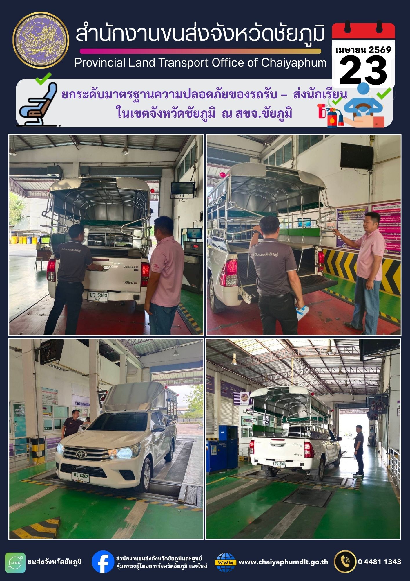 สำนักงานขนส่งจังหวัดชัยภูมิ โดย นายปริญญา หัสดินทร ณ อยุธยา ขนส่งจังหวัดชัยภูมิ มอบหมายให้เจ้าหน้าที่สำนักงานขนส่งจังหวัดชัยภูมิ และ สาขา ลงพื้นที่ออกประชาสัมพันธ์ในการยกระดับมาตรฐานความปลอดภัยของรถรับ – ส่งนักเรียนในเขตจังหวัดชัยภูมิ พร้อมทั้ง อำนวยความสะดวกแก่ผู้ประกอบการรถรับ-ส่งนักเรียน ในการนำรถเข้ารับการตรวจสภาพรถ ได้แก่ ระบบห้ามล้อ ระบบบังคับเลี้ยว เบาะที่นั่ง อุปกรณ์ส่วนควบ ความมั่นคงแข็งแรงของตัวรถ และอุปกรณ์ความปลอดภัยต่างๆ ณ ฝ่ายตรวจสภาพรถ สำนักงานขนส่งจังหวัดชัยภูมิ และสาขา