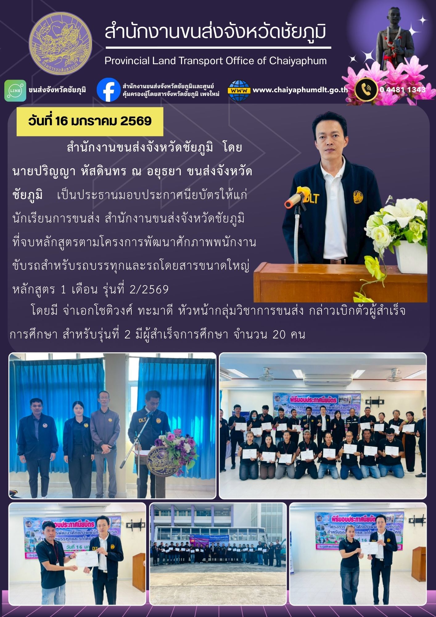 มอบประกาศนียบัตรให้แก่นักเรียนการขนส่ง สำนักงานขนส่งจังหวัดชัยภูมิ