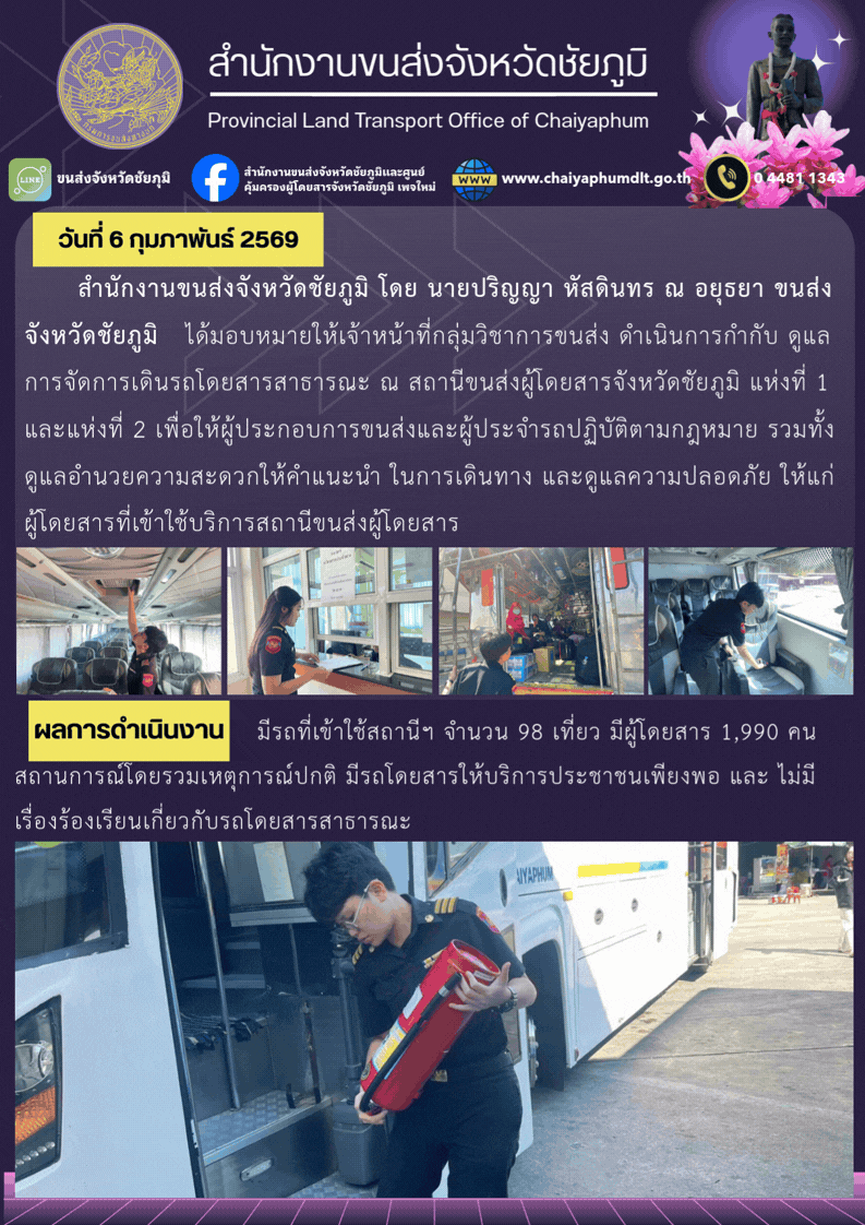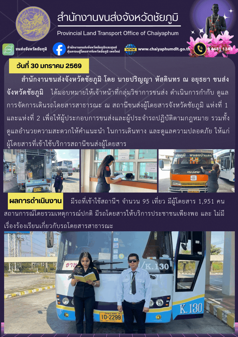 ดำเนินการกำกับ ดูแล การจัดการเดินรถโดยสารสาธารณะ ณ สถานีขนส่งผู้โดยสารจังหวัดชัยภูมิ