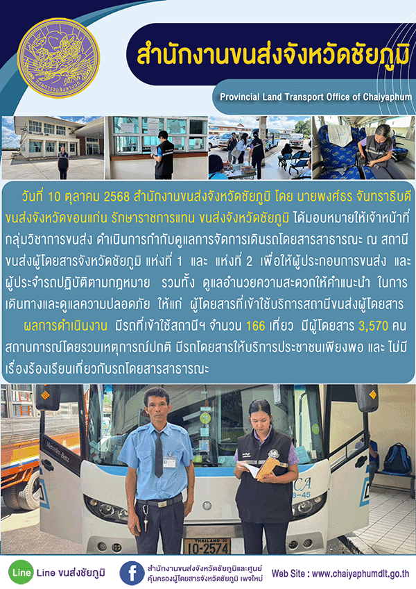 ดำเนินการกำกับ ดูแล การจัดการเดินรถโดยสารสาธารณะ ณ สถานีขนส่งผู้โดยสารจังหวัดชัยภูมิ