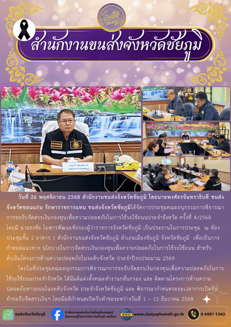 สำนักงานขนส่งจังหวัดชัยภูมิ โดยนายพงศ์ธร จันทราธิบดี ขนส่งจังหวัดขอนแก่น รักษาราชการแทน ขนส่งจังหวัดชัยภูมิ ได้จัดการประชุมคณะอนุกรรมการพิจารณาการขอรับจัดสรรเงินกองทุนเพื่อความปลอดภัยในการใช้รถใช้ถนนประจำจังหวัด ครั้งที่ 4/2568 โดยมีนายธงชัย โอฬารพัฒนะชัย รองผู้ว่าราชการจังหวัดชัยภูมิ เป็นประธานในการประชุม ณ ห้องประชุมชั้น 1 อาคาร 1 สำนักงานขนส่งจังหวัดชัยภูมิ อำเภอเมืองชัยภูมิ จังหวัดชัยภูมิ เพื่อเป็นการกำหนดแนวทาง นโยบายในการจัดสรรเงินกองทุนเพื่อความปลอดภัยในการใช้รถใช้ถนน สำหรับดำเนินโครงการด้านความปลอดภัยในระดับจังหวัด ประจำปีงบประมาณ 2569