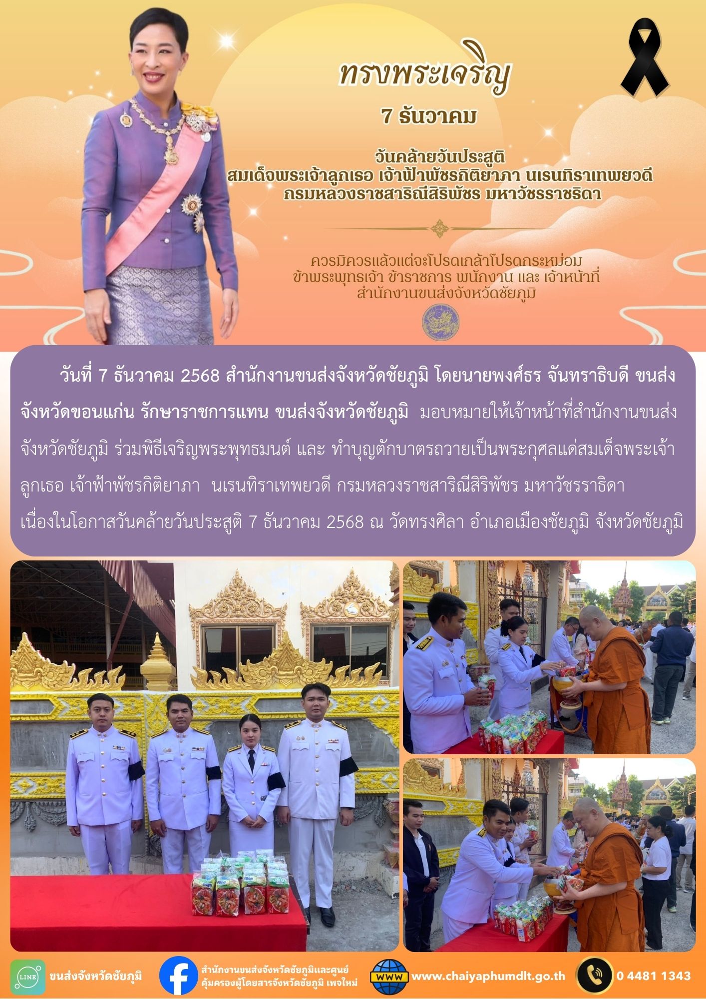 สำนักงานขนส่งจังหวัดชัยภูมิ โดยนายพงศ์ธร จันทราธิบดี ขนส่งจังหวัดขอนแก่น รักษาราชการแทน ขนส่งจังหวัดชัยภูมิ มอบหมายให้เจ้าหน้าที่สำนักงานขนส่งจังหวัดชัยภูมิ ร่วมพิธีเจริญพระพุทธมนต์ และทำบุญตักบาตร ถวายเป็นพระกุศลแด่สมเด็จพระเจ้าลูกเธอ เจ้าฟ้าพัชรกิติยาภา นเรนทิราเทพยวดี กรมหลวงราชสาริณีสิริพัชร มหาวัชรราธิดา เนื่องในโอกาสวันคล้ายวันประสูติ 7 ธันวาคม 2568 ณ วัดทรงศิลา อำเภอเมืองชัยภูมิ จังหวัดชัยภูมิ