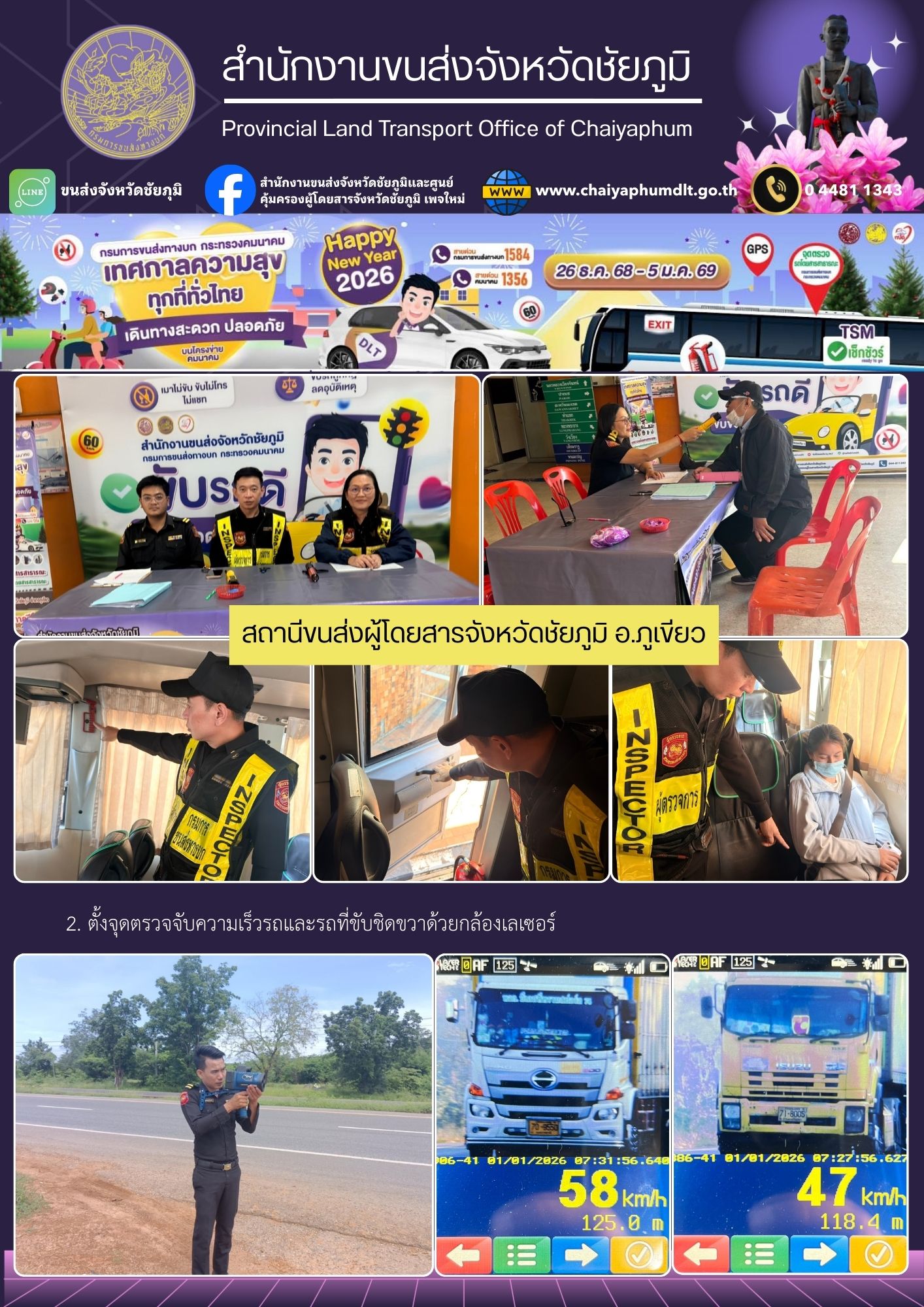 สำนักงานขนส่งจังหวัดชัยภูมิ โดย นายพงศ์ธร จันทราธิบดี ขนส่งจังหวัดขอนแก่น รักษาราชการแทน ขนส่งจังหวัดชัยภูมิ มอบหมายให้ผู้ตรวจการ และ เจ้าหน้าที่ สำนักงานขนส่งจังหวัดชัยภูมิ ดำเนินการตามแผนอำนวยความสะดวกและความปลอดภัย รองรับการเดินทางของประชาชน ในช่วงเทศกาลปีใหม่ 2569 ระหว่างวันที่ 26 ธันวาคม 2568 – 5 มกราคม 2569