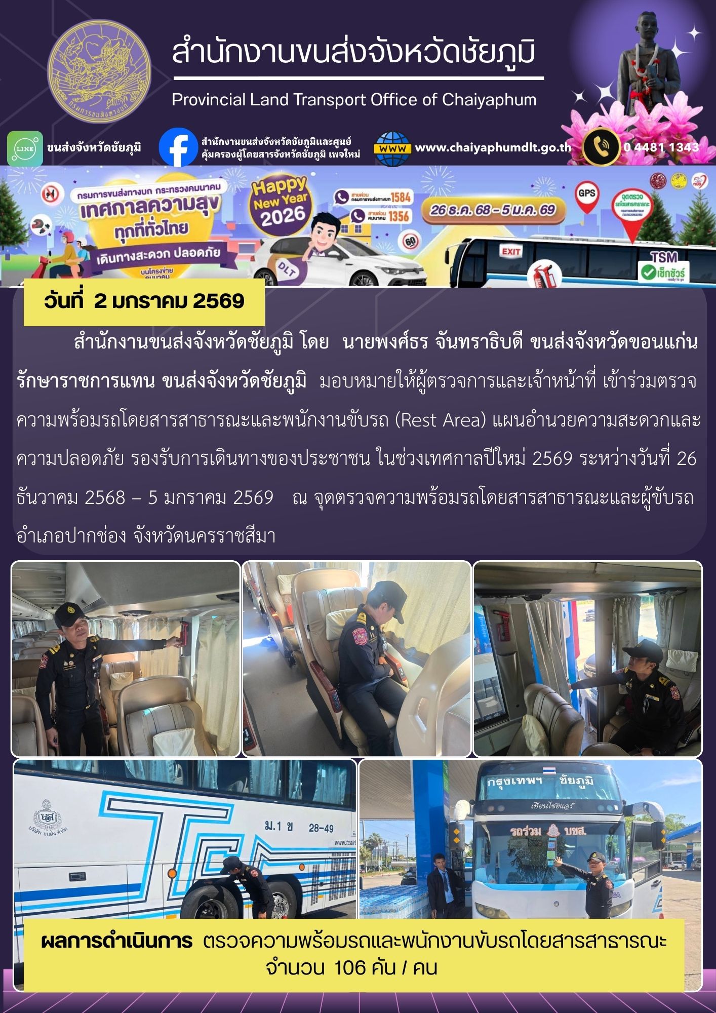 สำนักงานขนส่งจังหวัดชัยภูมิ โดย นายพงศ์ธร จันทราธิบดี ขนส่งจังหวัดขอนแก่น รักษาราชการแทน ขนส่งจังหวัดชัยภูมิ มอบหมายให้ผู้ตรวจการและเจ้าหน้าที่ เข้าร่วมตรวจความพร้อมรถโดยสารสาธารณะและพนักงานขับรถ (Rest Area) แผนอำนวยความสะดวกและความปลอดภัย รองรับการเดินทางของประชาชน ในช่วงเทศกาลปีใหม่ 2569 ระหว่างวันที่ 26 ธันวาคม 2568 – 5 มกราคม 2569 ณ จุดตรวจความพร้อมรถโดยสารสาธารณะและผู้ขับรถ อำเภอปากช่อง จังหวัดนครราชสีมา