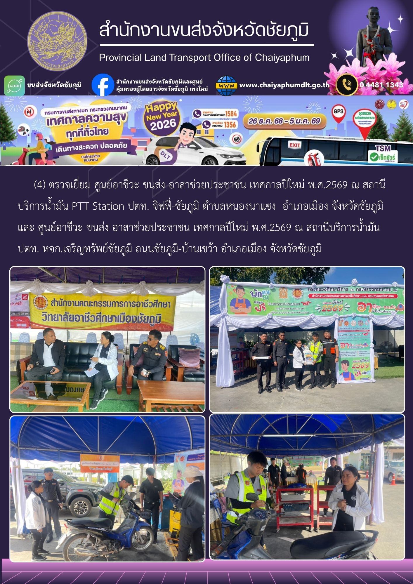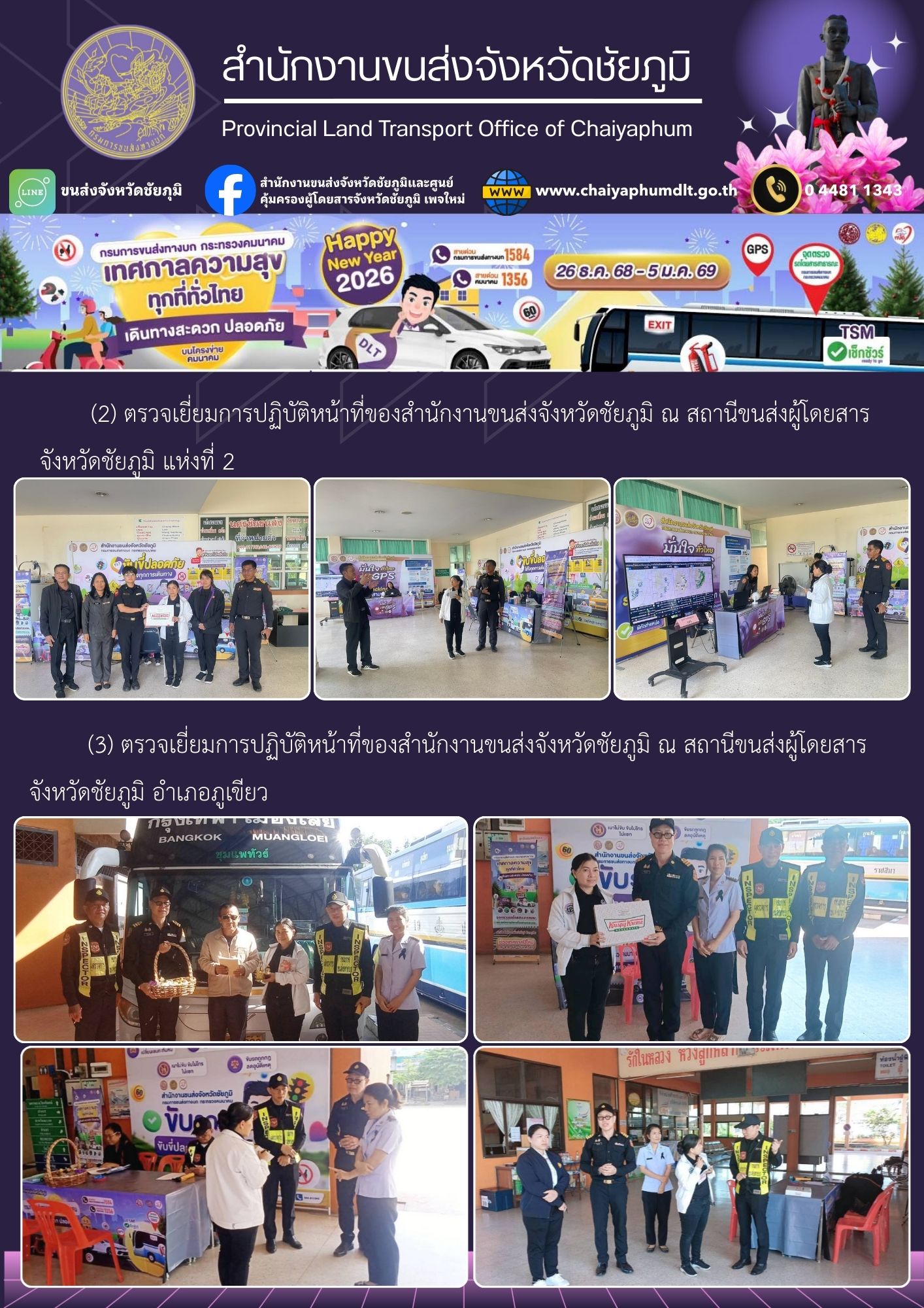 นางสาวสุกัญญา หมีบังเกิด ผู้ตรวจราชการกรมการขนส่งทางบก พร้อมคณะ ตรวจเยี่ยมการปฏิบัติหน้าที่ของเจ้าหน้าที่สำนักงานขนส่งจังหวัดชัยภูมิ และ ศูนย์อาชีวะ ขนส่ง อาสาช่วยประชาชน