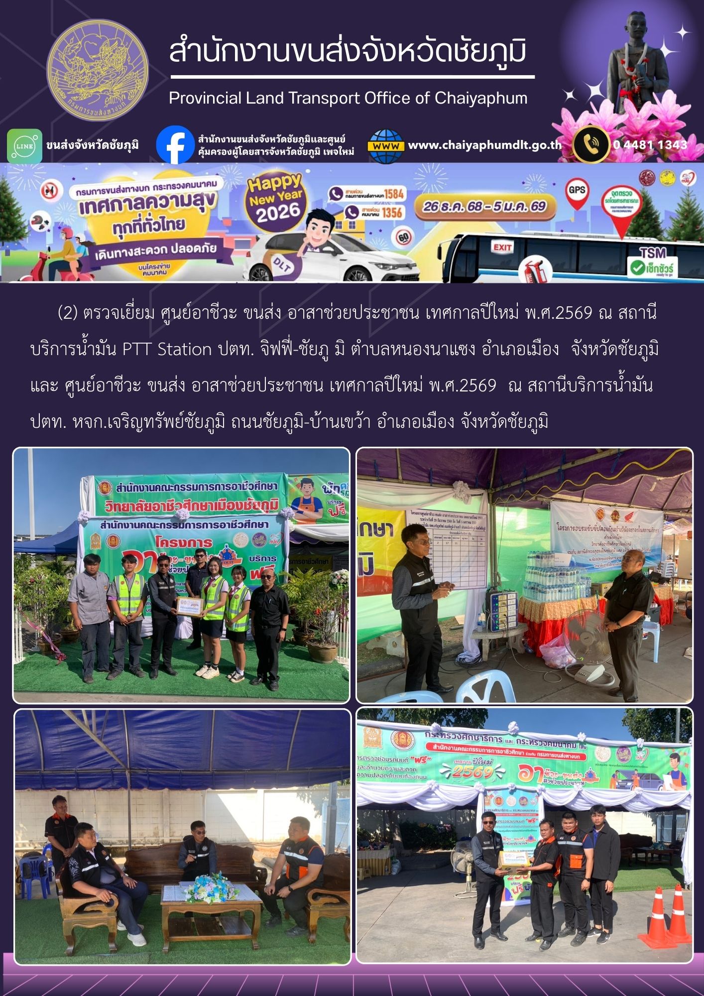 จ่าเอกโชติวงศ์ ทะมาดี หัวหน้ากลุ่มวิชาการขนส่ง สำนักงานขนส่งจังหวัดชัยภูมิ ได้ตรวจเยี่ยมการปฏิบัติหน้าที่ของเจ้าหน้าที่สำนักงานขนส่งจังหวัดชัยภูมิ และ ศูนย์อาชีวะ ขนส่ง อาสาช่วยประชาชน ตามโครงการรณรงค์ป้องกันและลดอุบัติเหตุทางถนน ช่วงเทศกาลปีใหม่ พ.ศ. 2569 ดังนี้