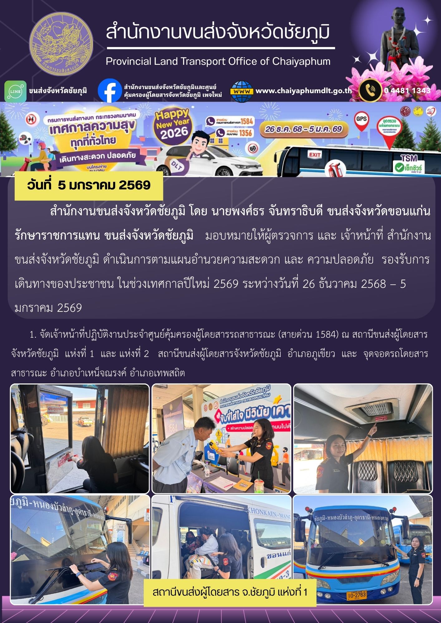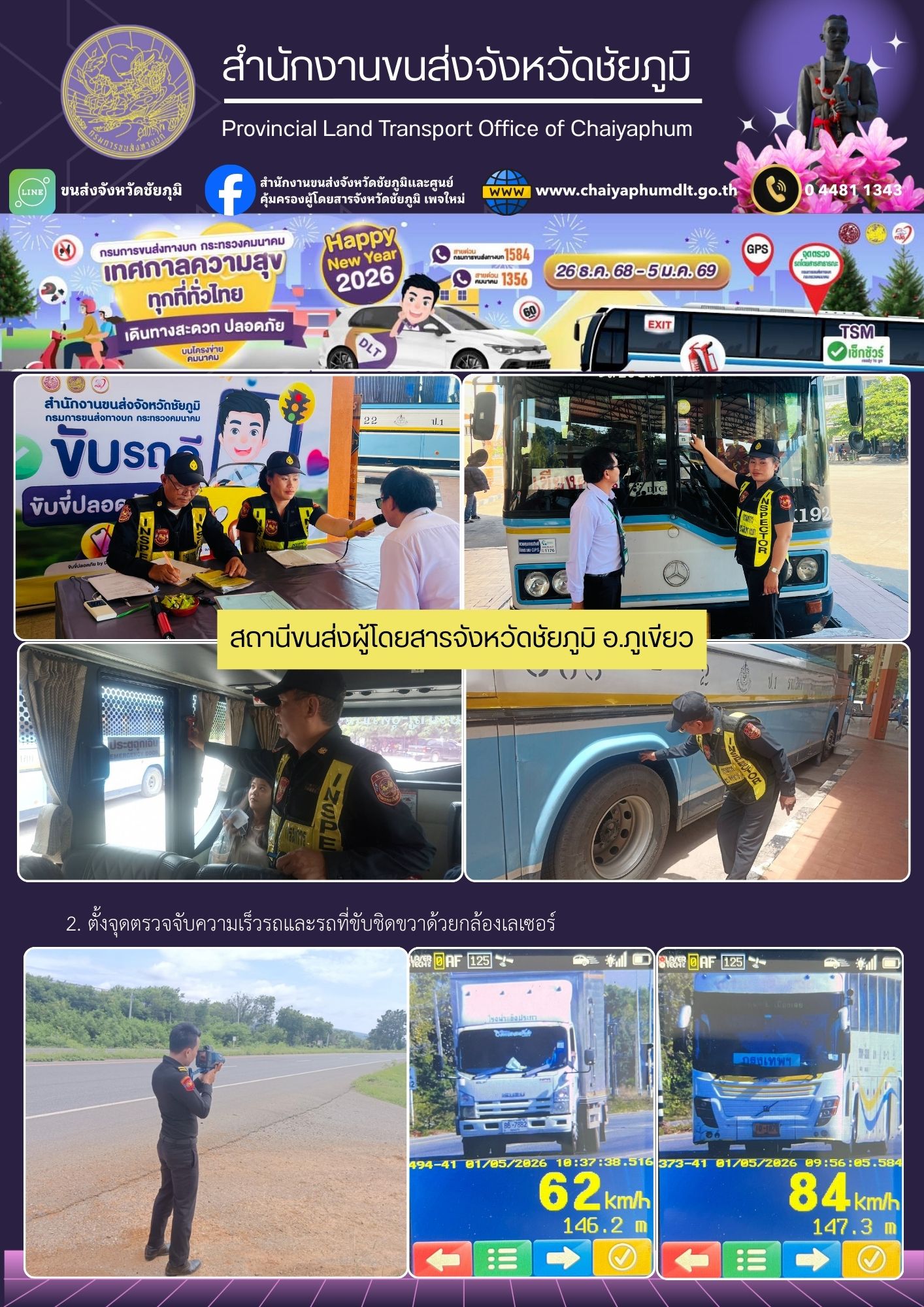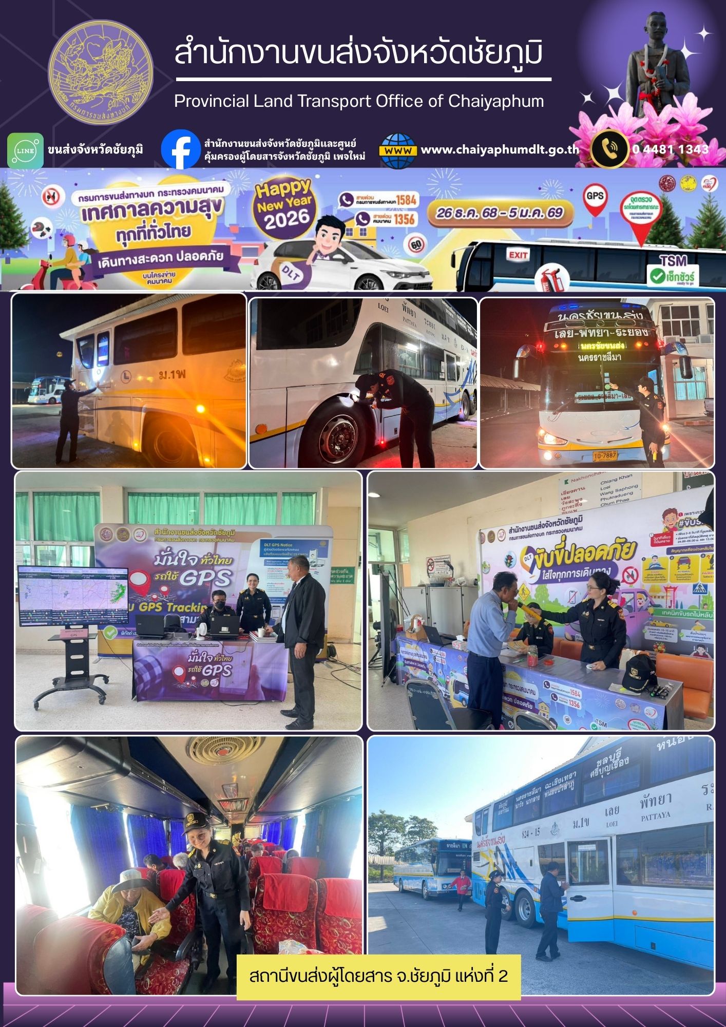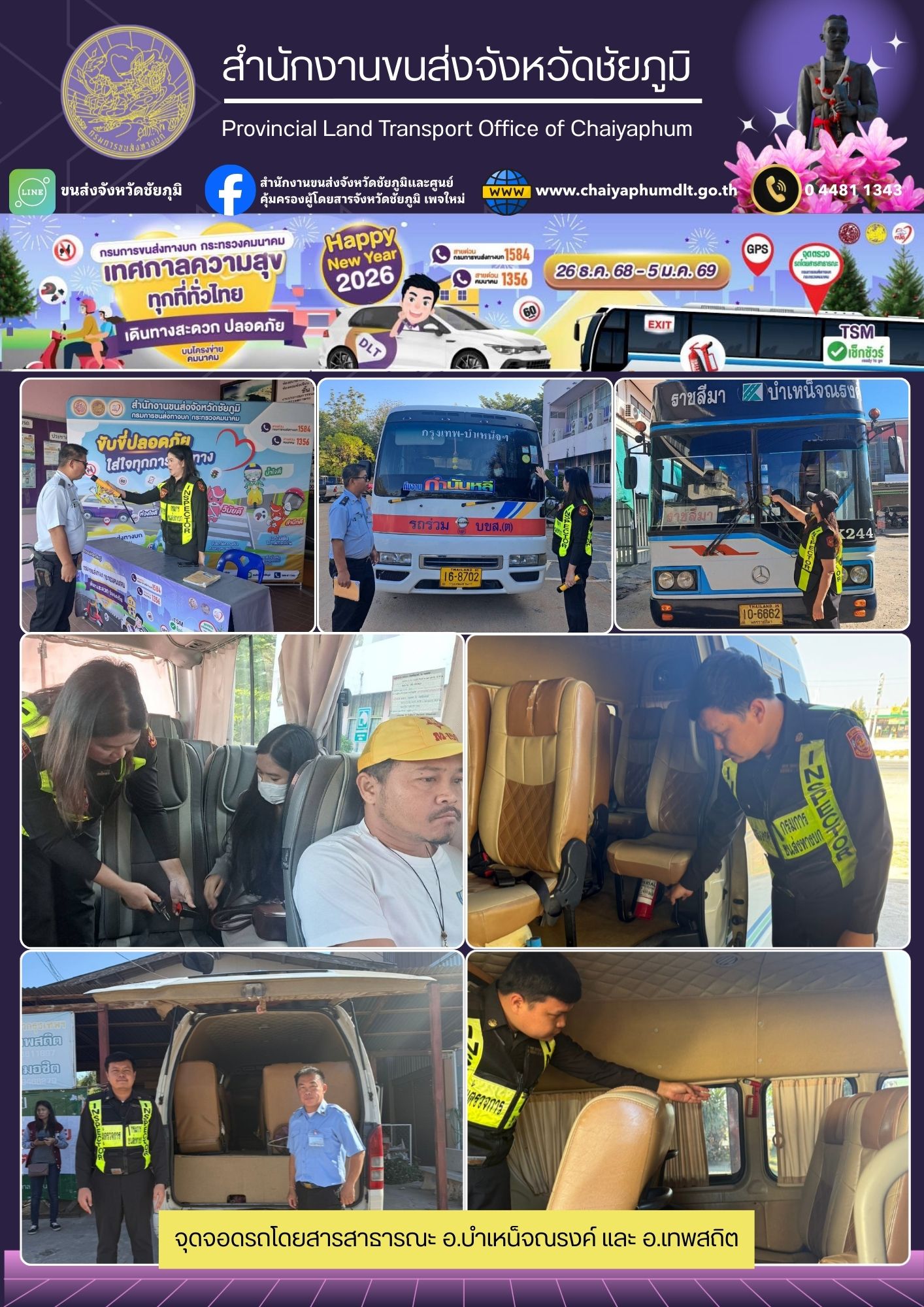สำนักงานขนส่งจังหวัดชัยภูมิ โดย นายพงศ์ธร จันทราธิบดี ขนส่งจังหวัดขอนแก่น รักษาราชการแทน ขนส่งจังหวัดชัยภูมิ มอบหมายให้ผู้ตรวจการ และ เจ้าหน้าที่ สำนักงานขนส่งจังหวัดชัยภูมิ ดำเนินการตามแผนอำนวยความสะดวกและความปลอดภัย รองรับการเดินทางของประชาชน ในช่วงเทศกาลปีใหม่ 2569 ระหว่างวันที่ 26 ธันวาคม 2568 – 5 มกราคม 2569