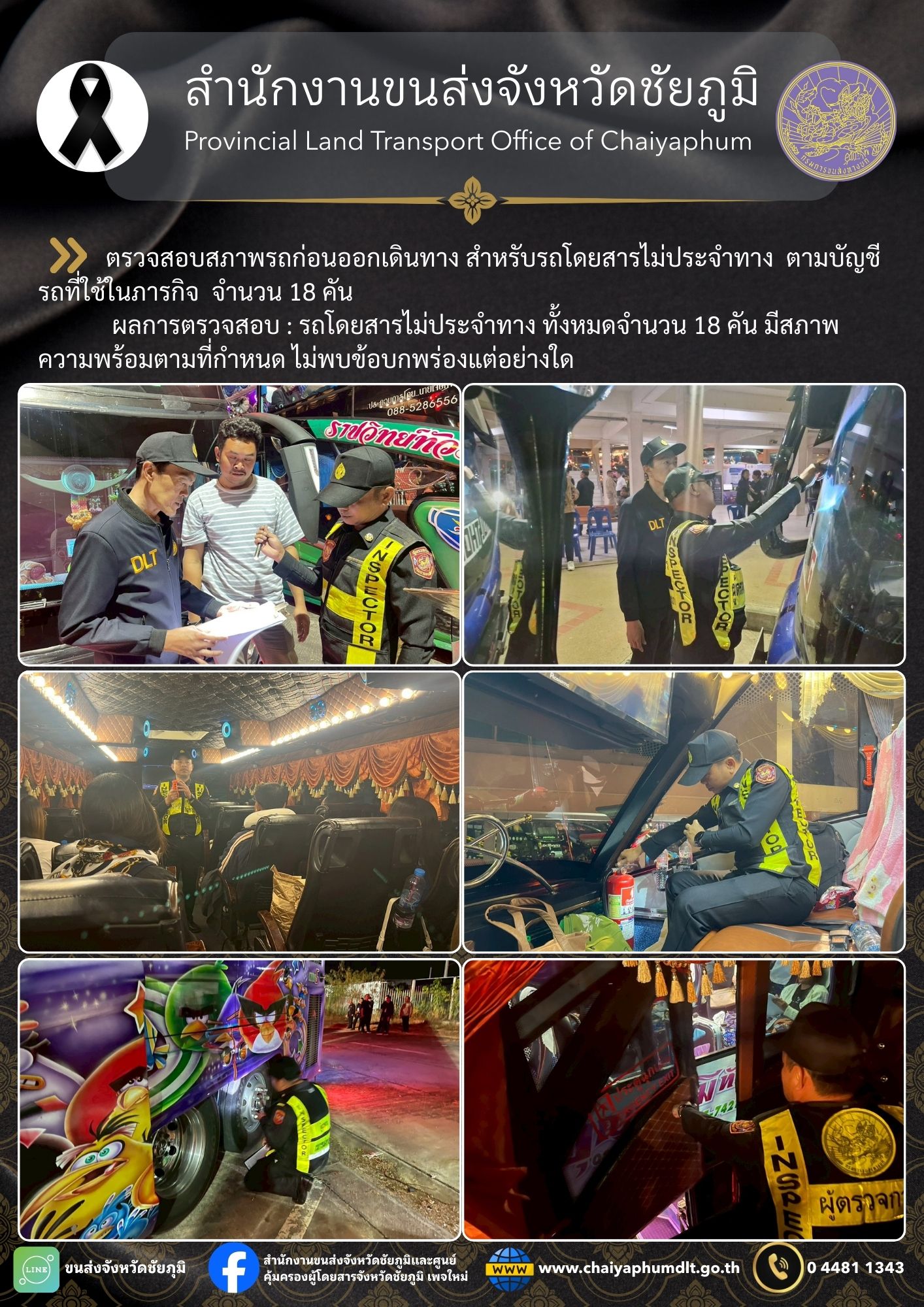 3. ตรวจสอบสภาพรถก่อนออกเดินทาง สำหรับรถโดยสารไม่ประจำทาง ตามบัญชีรถที่ใช้ในภารกิจ จำนวน 18 คัน ผลการตรวจสอบ : รถโดยสารไม่ประจำทาง ทั้งหมดจำนวน 18 คัน มีสภาพความพร้อมตามที่กำหนด ไม่พบข้อบกพร่องแต่อย่างใด