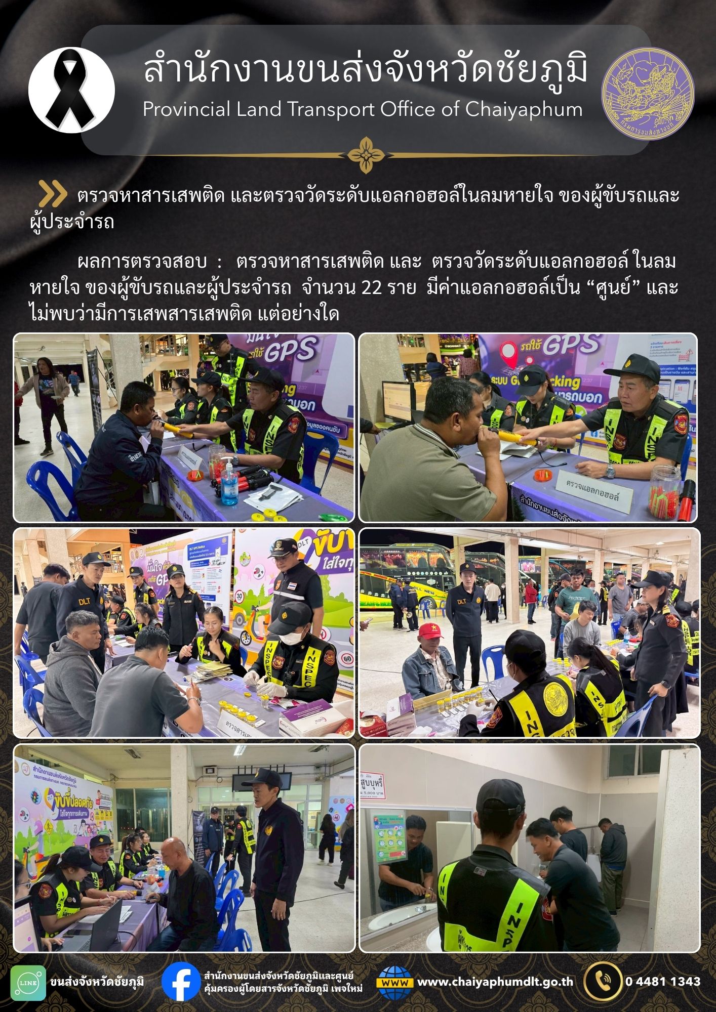 2. ตรวจหาสารเสพติด และตรวจวัดระดับแอลกอฮอล์ในลมหายใจ ของผู้ขับรถและผู้ประจำรถ ผลการตรวจสอบ : ตรวจหาสารเสพติด และตรวจวัดระดับแอลกอฮอล์ในลมหายใจ ของผู้ขับรถและผู้ประจำรถ จำนวน 22 ราย มีค่าแอลกอฮอล์เป็น “ศูนย์” และไม่พบว่ามีการเสพสารเสพติด แต่อย่างใด