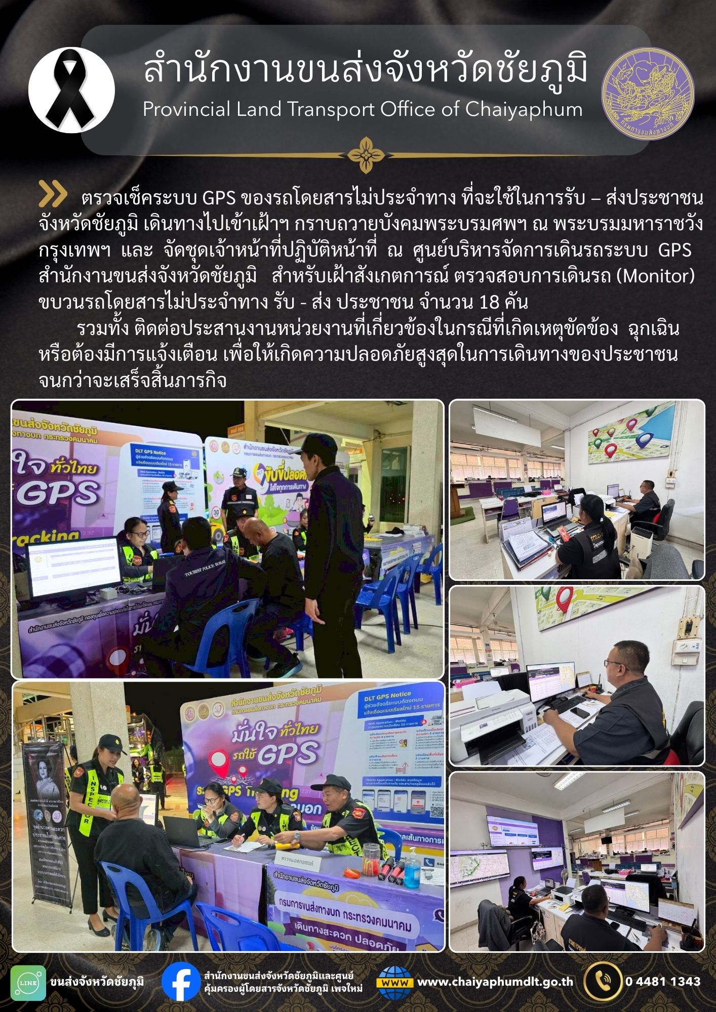 ตรวจเช็คระบบ GPS ของรถโดยสารไม่ประจำทาง ที่จะใช้ในการรับ – ส่งประชาชนจังหวัดชัยภูมิ เดินทางไปเข้าเฝ้าฯ กราบถวายบังคมพระบรมศพฯ ณ พระบรมมหาราชวัง กรุงเทพฯ และจัดชุดเจ้าหน้าที่ปฏิบัติหน้าที่ ณ ศูนย์บริหารจัดการเดินรถระบบ GPS สำนักงานขนส่งจังหวัดชัยภูมิ สำหรับเฝ้าสังเกตการณ์ ตรวจสอบการเดินรถ (Monitor) ขบวนรถโดยสารไม่ประจำทาง รับ - ส่ง ประชาชน จำนวน 18 คัน