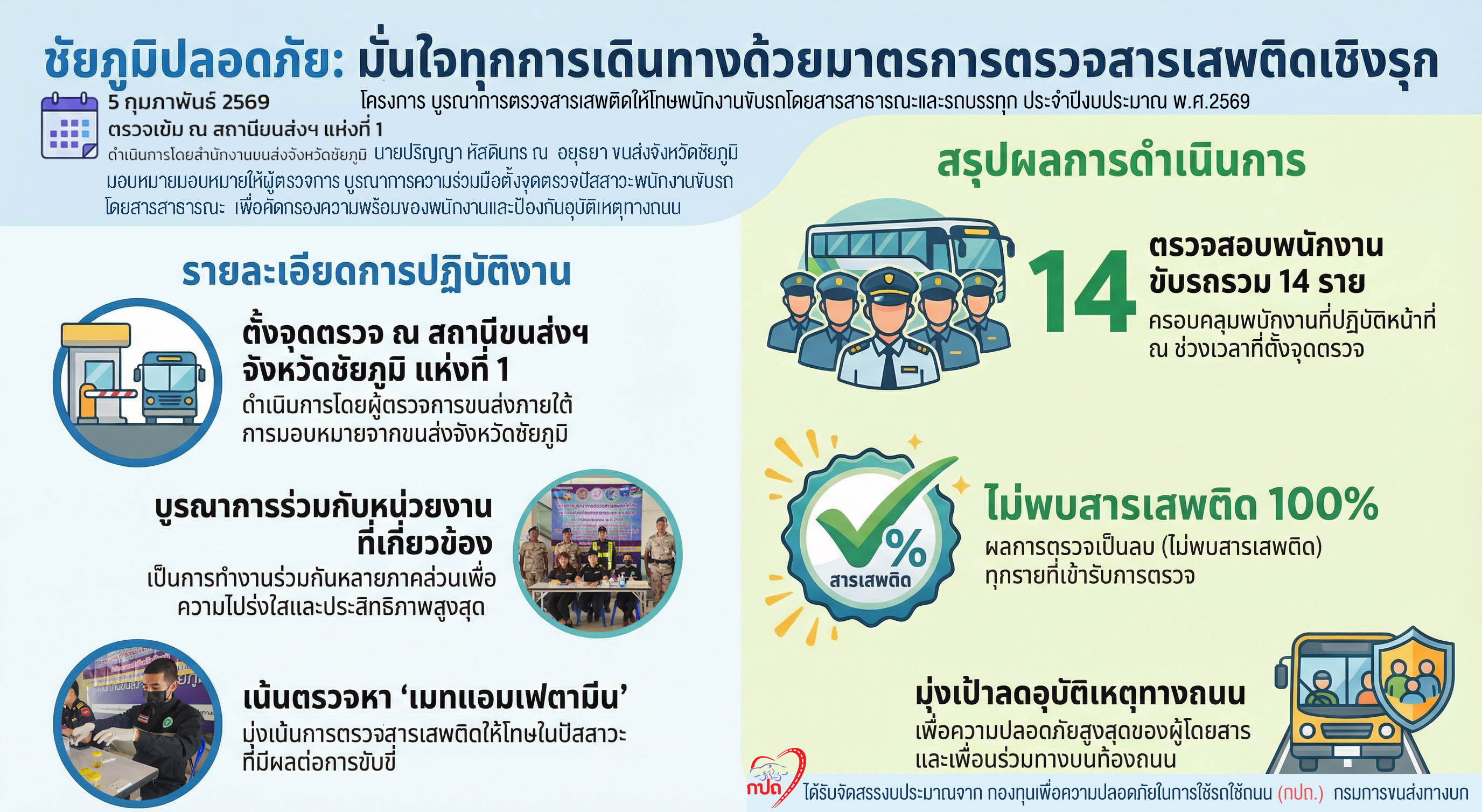 สำนักงานขนส่งจังหวัดชัยภูมิ โดย นายปริญญา หัสดินทร ณ อยุธยา ขนส่งจังหวัดชัยภูมิ ได้มอบหมายให้ผู้ตรวจการตั้งจุดตรวจสอบสารเสพติดให้โทษ (เมทแอมเฟตามีน) ในปัสสาวะของพนักงานขับรถโดยสารสาธารณะ เพื่อป้องกันและลดอุบัติเหตุทางถนน ณ บริเวณสถานีขนส่งผู้โดยสารจังหวัดชัยภูมิ แห่งที่ 1 โดยบูรณาการร่วมกับหน่วยงานที่เกี่ยวข้องในจังหวัดชัยภูมิ