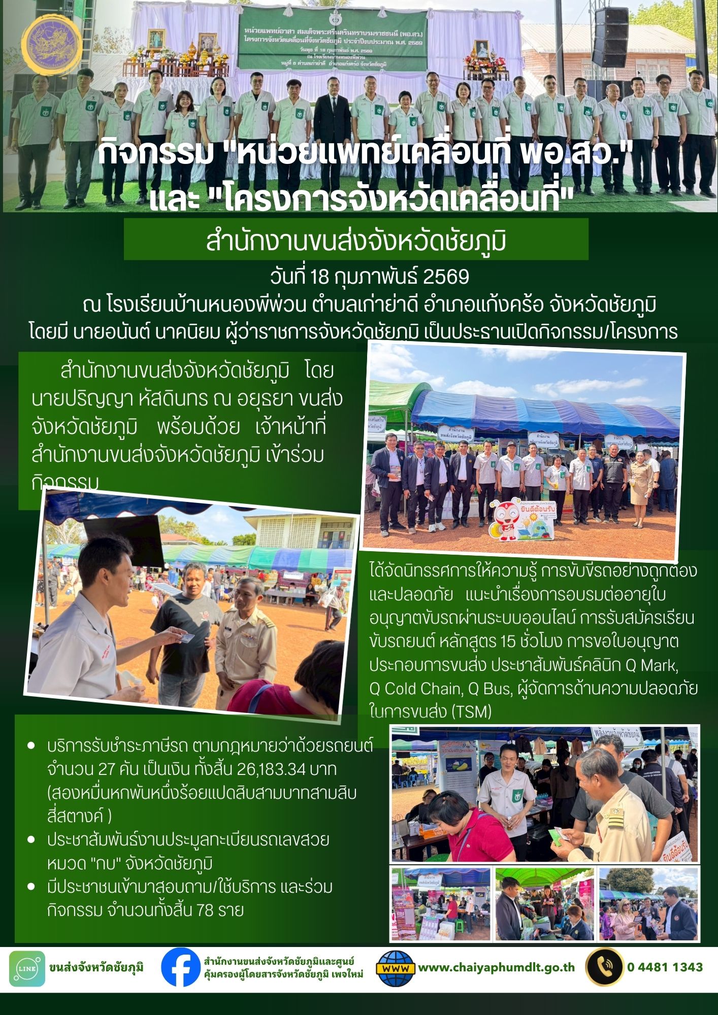 สำนักงานขนส่งจังหวัดชัยภูมิ โดย นายปริญญา หัสดินทร ณ อยุธยา ขนส่งจังหวัดชัยภูมิ พร้อมด้วยเจ้าหน้าที่สำนักงานขนส่งจังหวัดชัยภูมิ เข้าร่วมกิจกรรม "หน่วยแพทย์เคลื่อนที่ พอ.สว." และ "โครงการจังหวัดเคลื่อนที่" ณ โรงเรียนบ้านหนองพีพ่วน ตำบลเก่าย่าดี อำเภอแก้งคร้อ จังหวัดชัยภูมิ ร่วมกับหน่วยงานราชการในจังหวัดชัยภูมิ โดยมี นายอนันต์ นาคนิยม ผู้ว่าราชการจังหวัดชัยภูมิ เป็นประธานเปิดกิจกรรม/โครงการ ทั้งนี้ สำนักงานขนส่งจังหวัดชัยภูมิ ได้จัดนิทรรศการให้ความรู้ การขับขี่รถอย่างถูกต้องและปลอดภัย แนะนำเรื่องการอบรมต่ออายุใบอนุญาตขับรถผ่านระบบออนไลน์ การรับสมัครเรียนขับรถยนต์ หลักสูตร 15 ชั่วโมง การขอใบอนุญาตประกอบการขนส่ง ประชาสัมพันธ์คลินิก Q Mark, Q Cold Chain, Q Bus, ผู้จัดการด้านความปลอดภัยในการขนส่ง (TSM) รวมทั้ง บริการรับชำระภาษีรถ ตามกฎหมายว่าด้วยรถยนต์จำนวน 27 คัน เป็นเงิน ทั้งสิ้น 26,183.34 บาท (สองหมื่นหกพันหนึ่งร้อยแปดสิบสามบาทสามสิบสี่สตางค์ ) และประชาสัมพันธ์งานประมูลทะเบียนรถเลขสวย หมวด "กบ" จังหวัดชัยภูมิ ทั้งนี้ มีประชาชนเข้ามาสอบถาม/ใช้บริการ และร่วมกิจกรรม จำนวนทั้งสิ้น 78 ราย