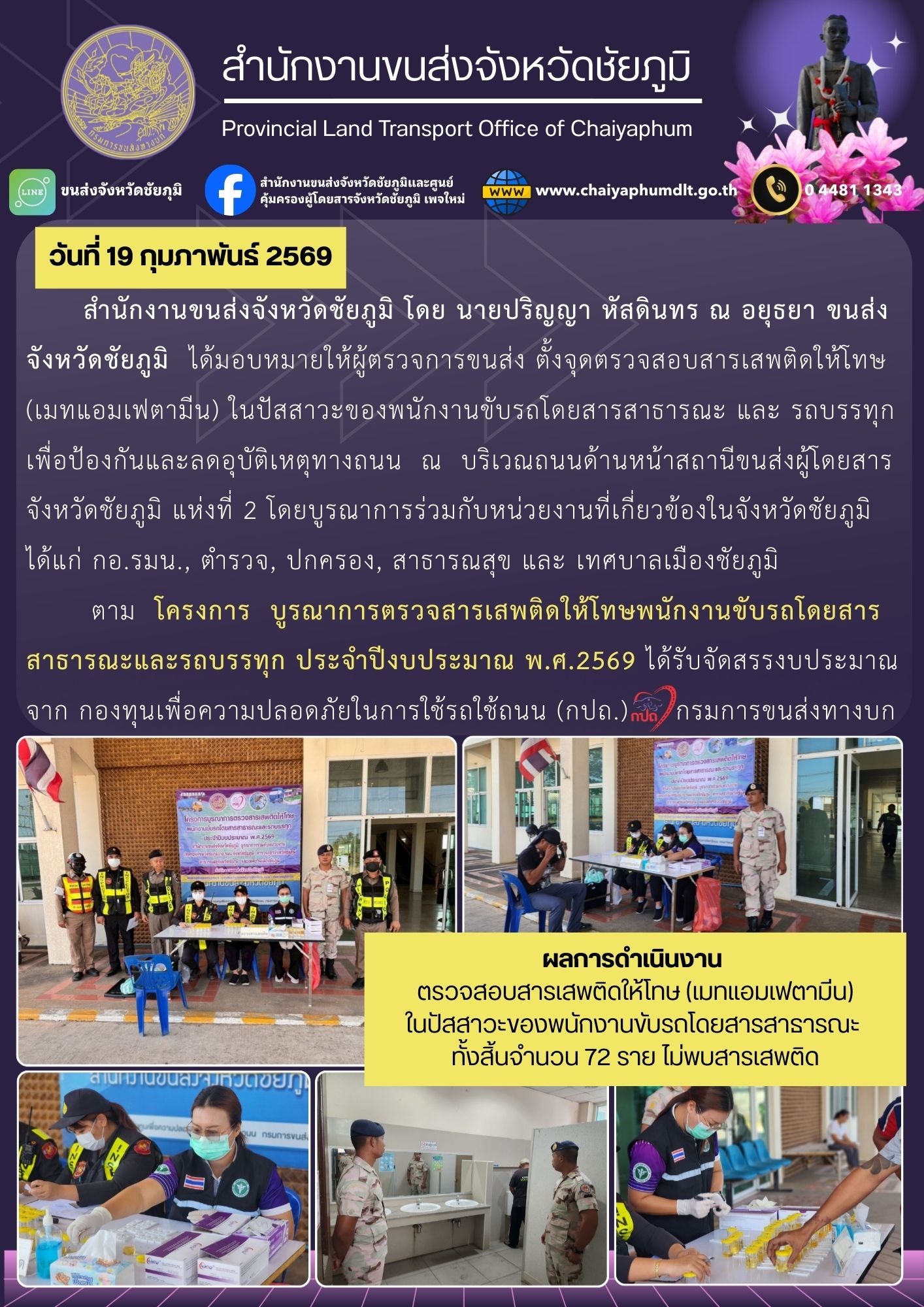 สำนักงานขนส่งจังหวัดชัยภูมิ โดย นายปริญญา หัสดินทร ณ อยุธยาขนส่งจังหวัดชัยภูมิ ได้มอบหมายให้ผู้ตรวจการขนส่งตั้งจุดตรวจสอบสารเสพติดให้โทษ (เมทแอมเฟตามีน) ในปัสสาวะของพนักงานขับรถโดยสารสาธารณะและรถบรรทุก เพื่อป้องกันและลดอุบัติเหตุทางถนน ณ บริเวณถนนด้านหน้าสถานีขนส่งผู้โดยสารจังหวัดชัยภูมิ แห่งที่ 2 โดยบูรณาการร่วมกับหน่วยงานที่เกี่ยวข้องในจังหวัดชัยภูมิ ได้แก่ กอ.รมน., ตำรวจ, ปกครอง, สาธารณสุข และเทศบาลเมืองชัยภูมิ